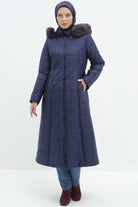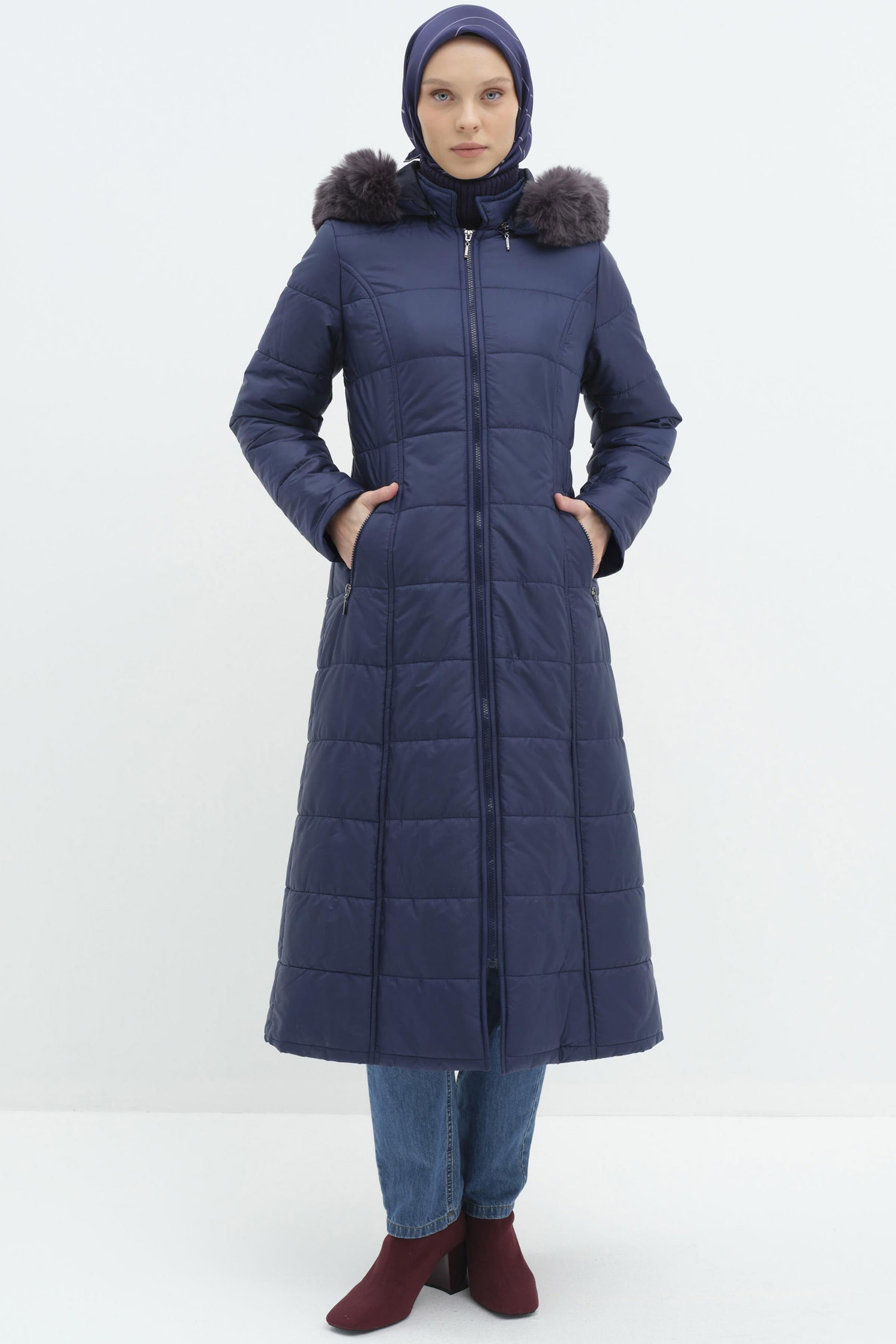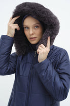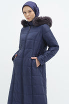 Kürk Kapüşonlu Şişme Manto - İndigo