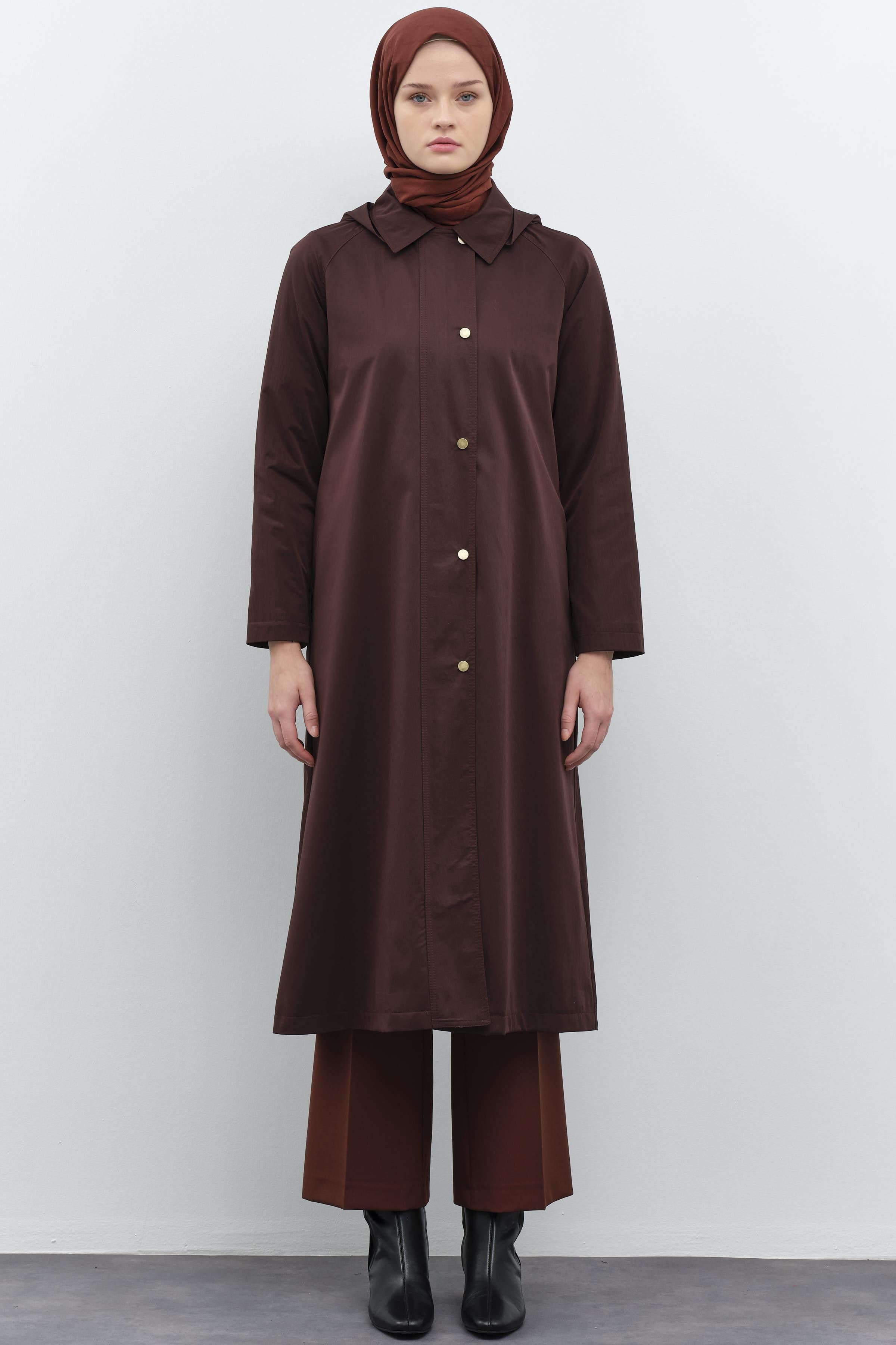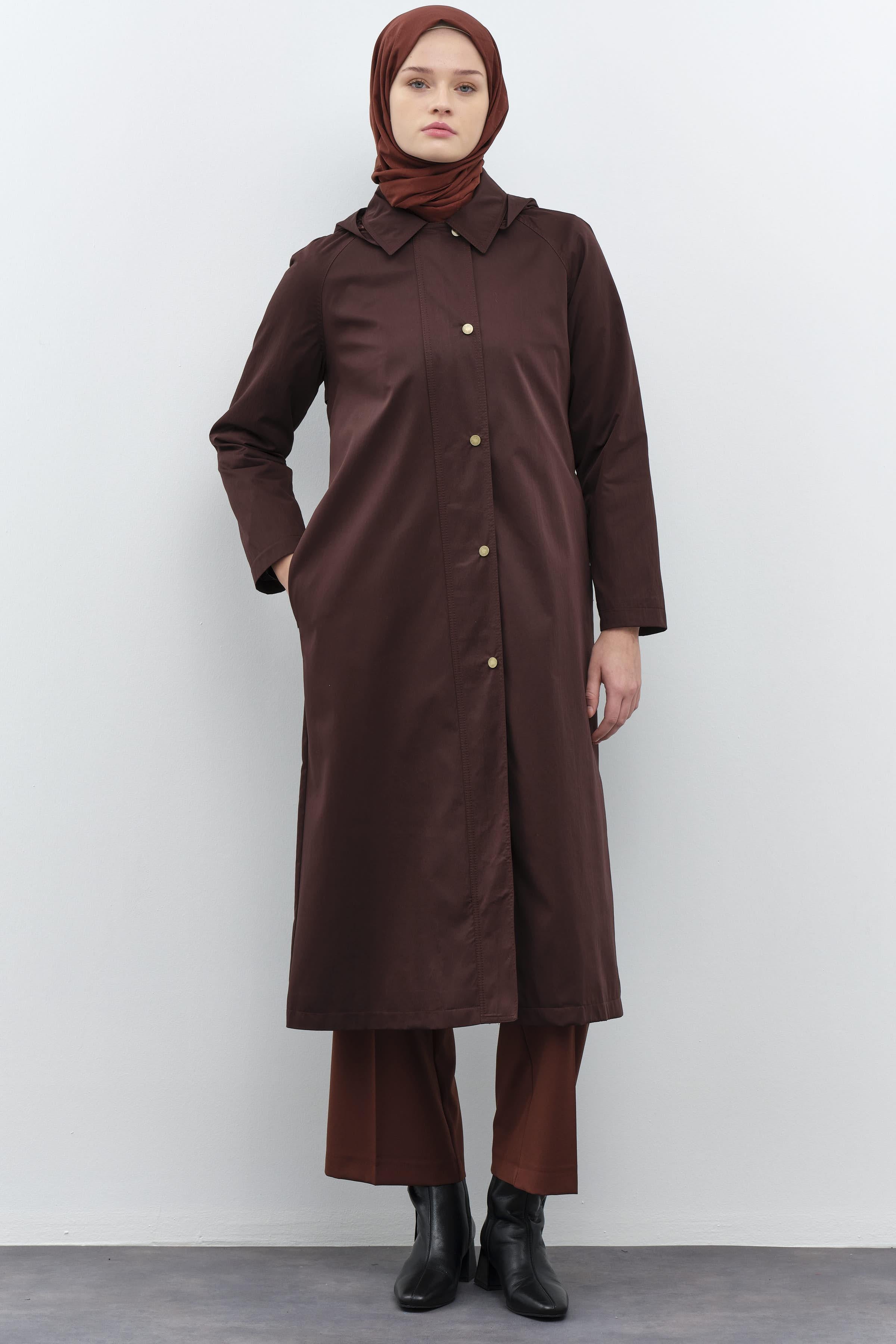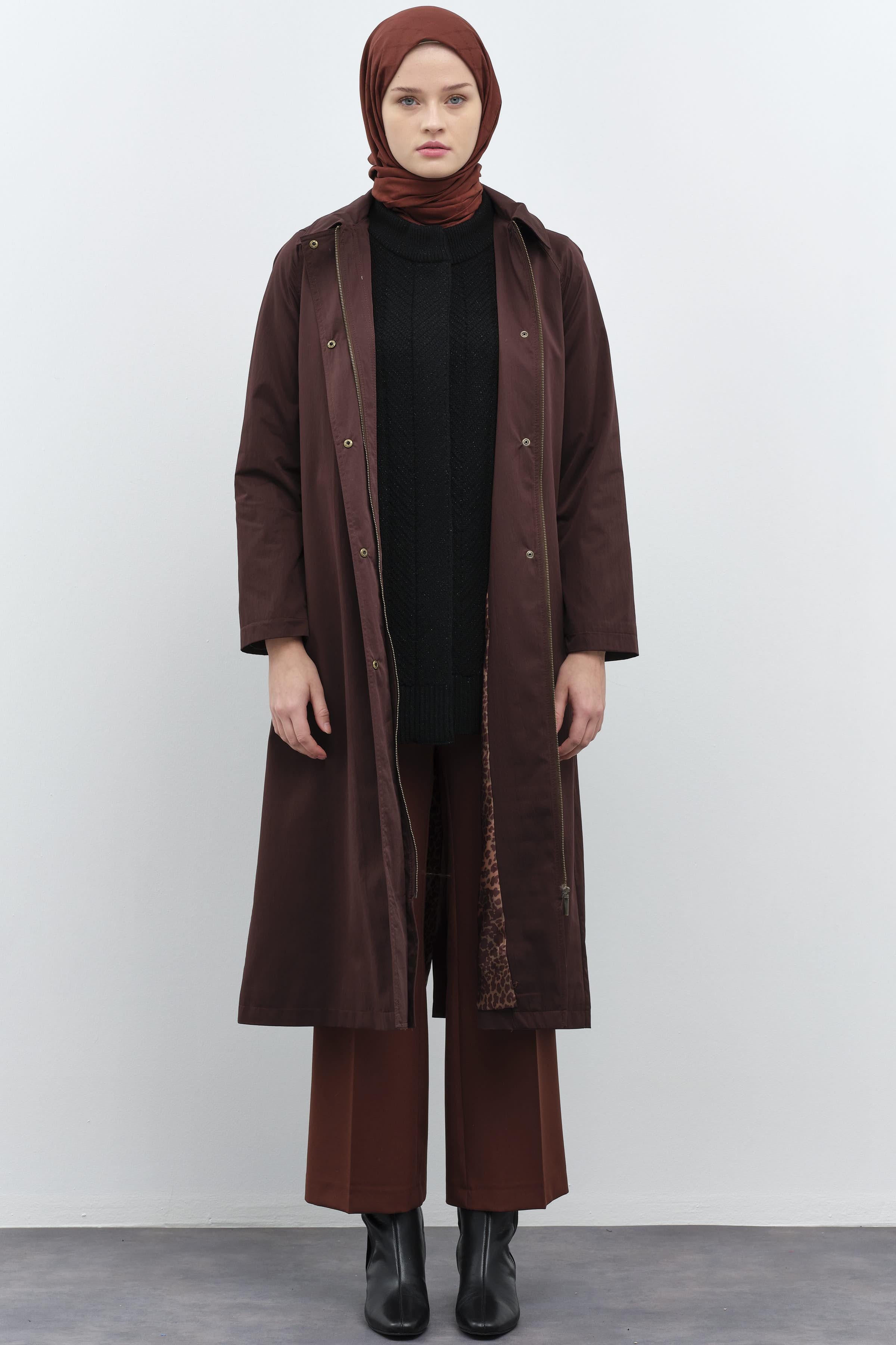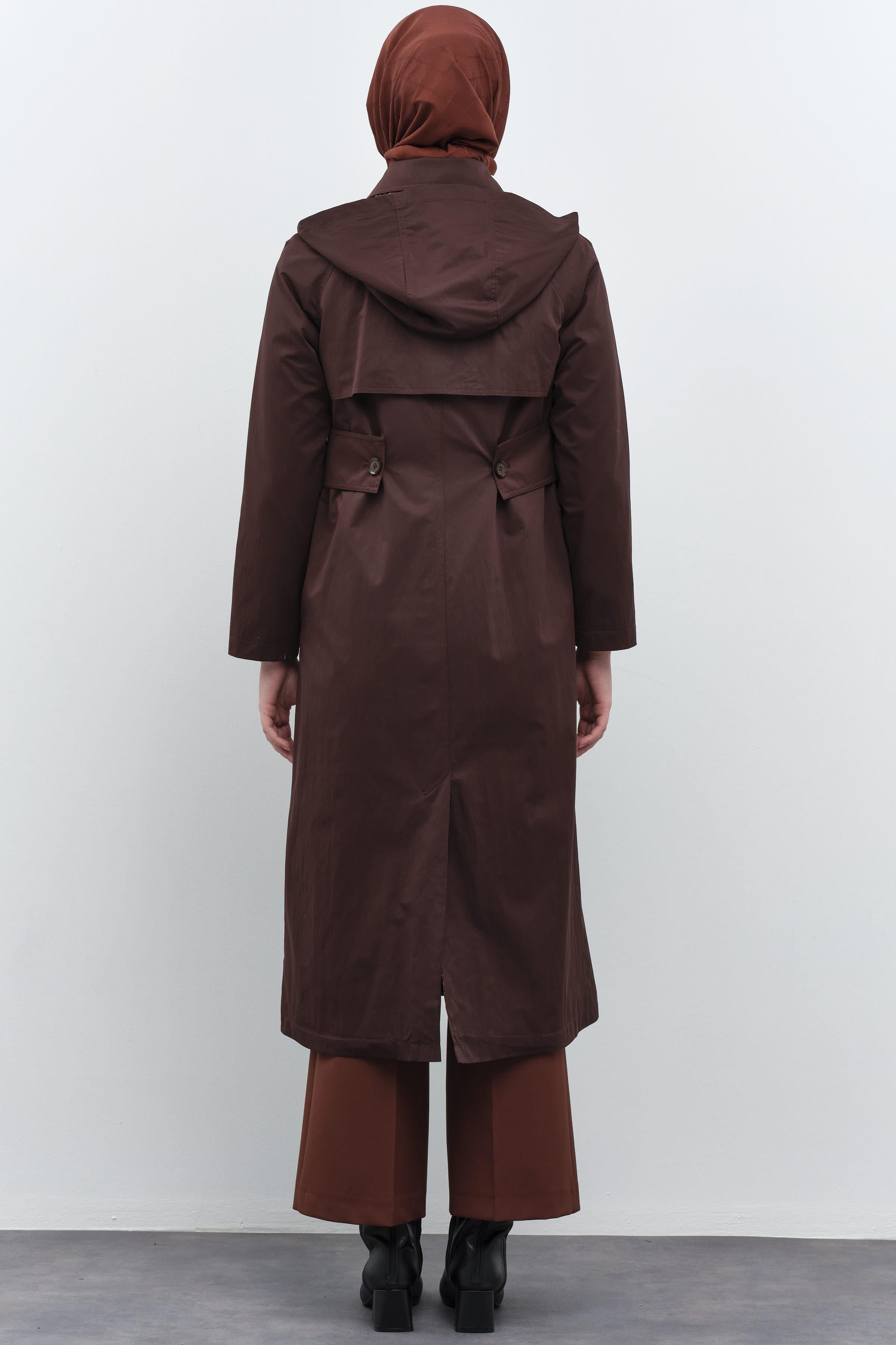 Leopar Astar Detaylı Kapüşonlu Trençkot - Kahve