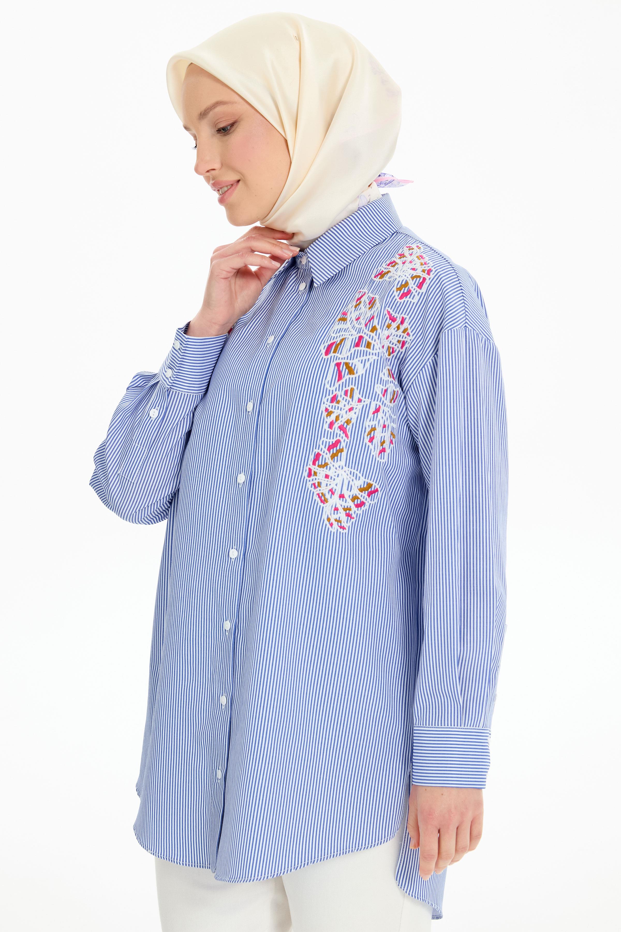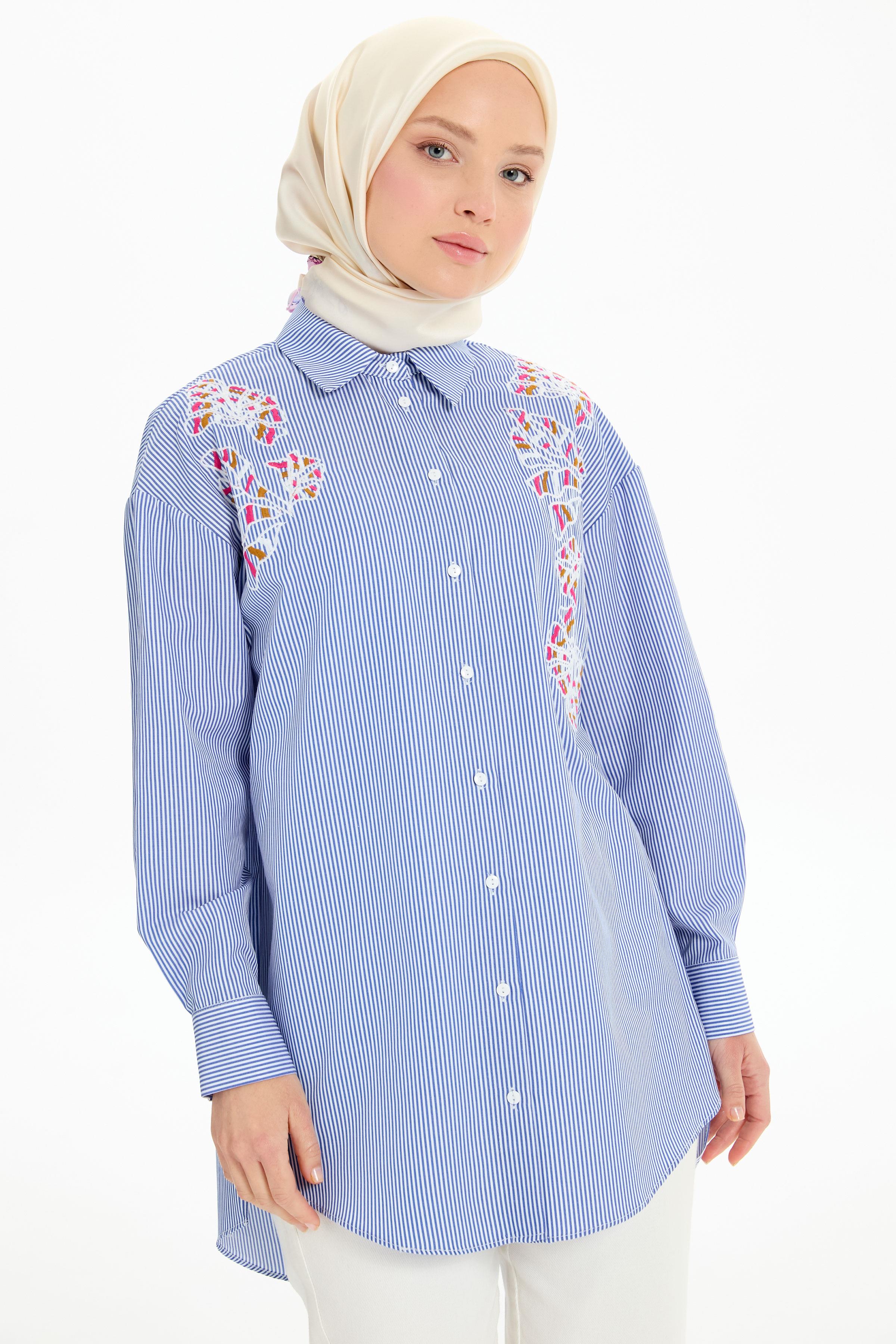 İnce işçiliğiyle öne çıkan nakış detayları ve çizgili deseniyle göz alıcı bir görünüm sunan bu tunik, modern bir tarza sahiptir.