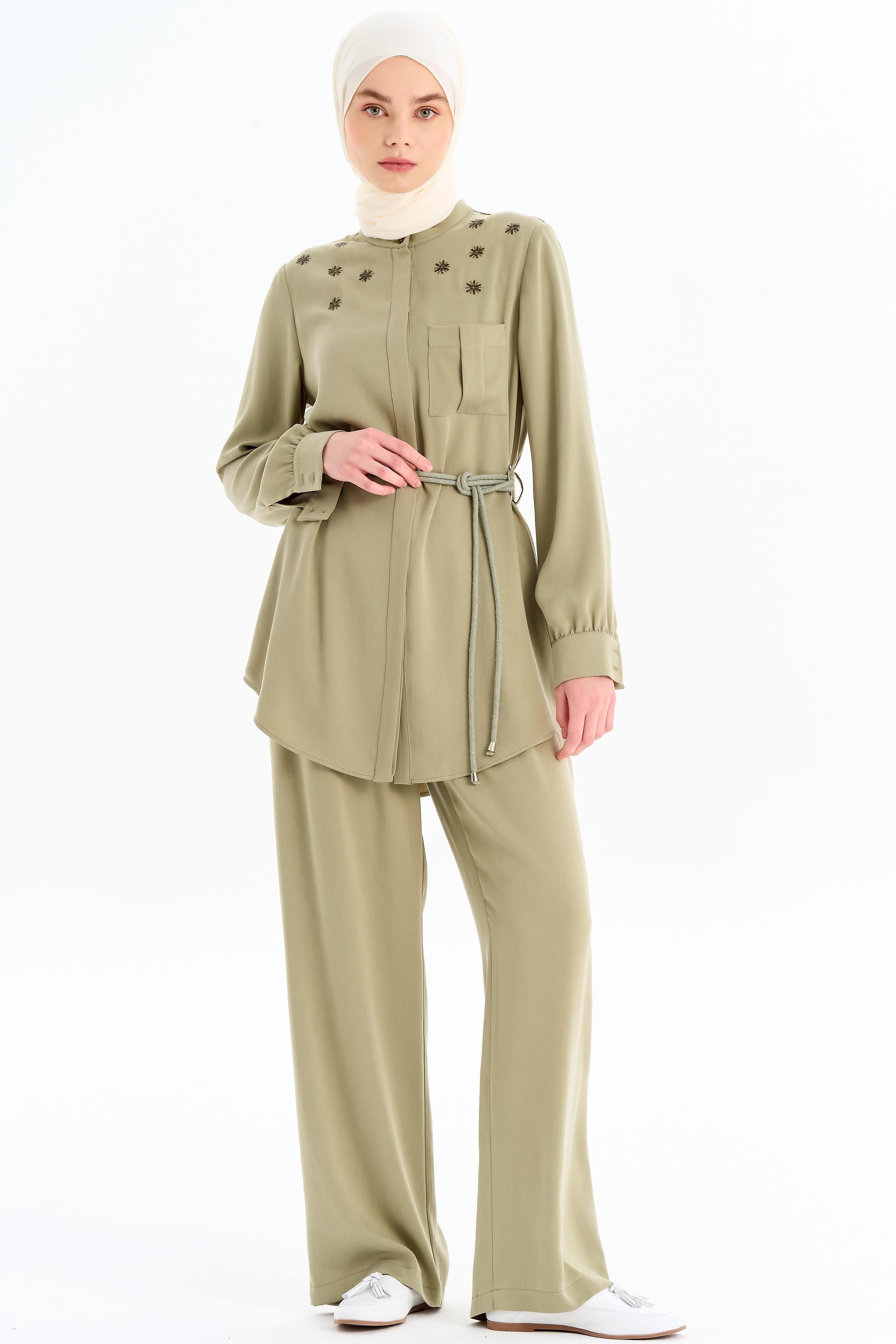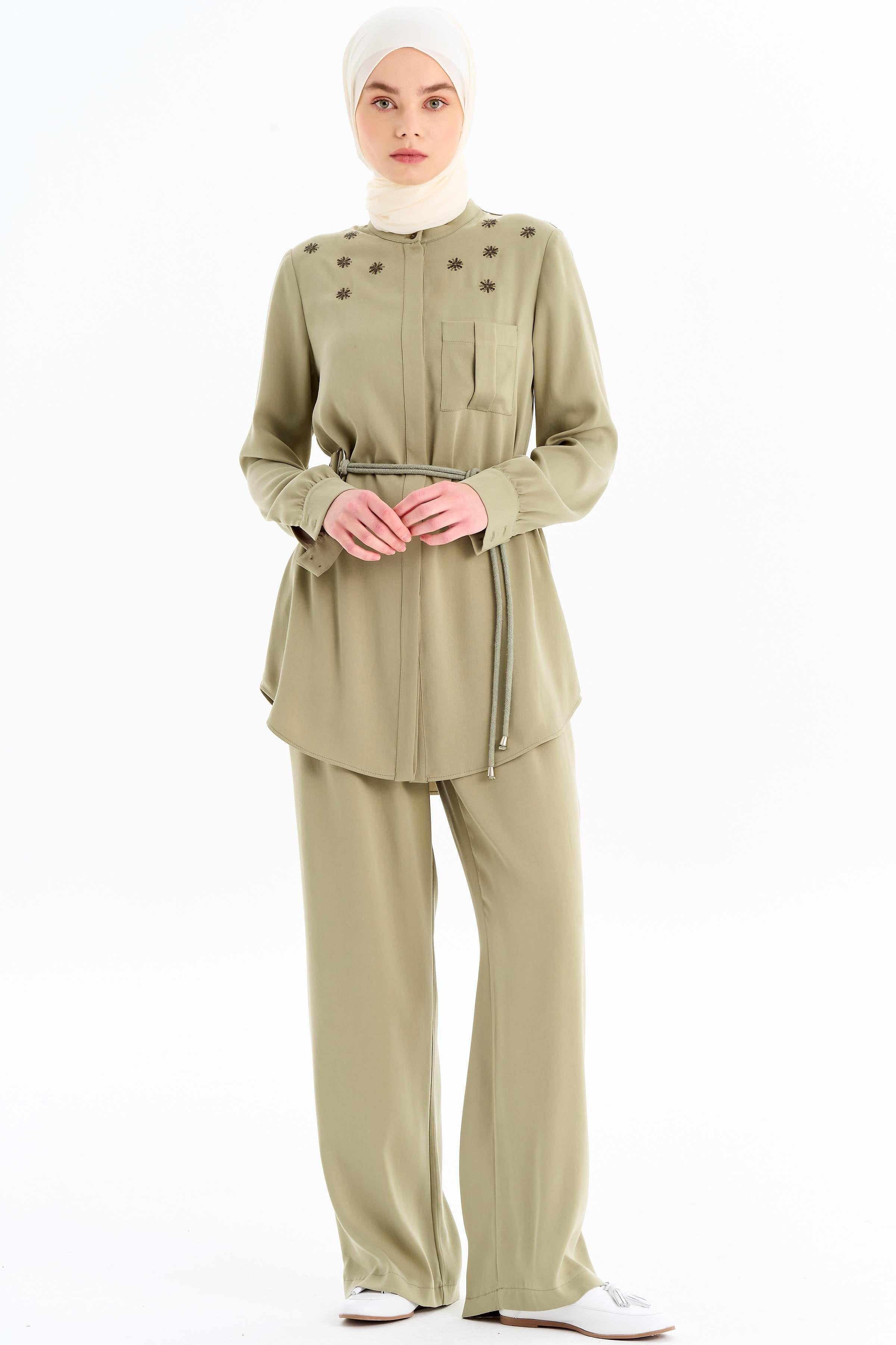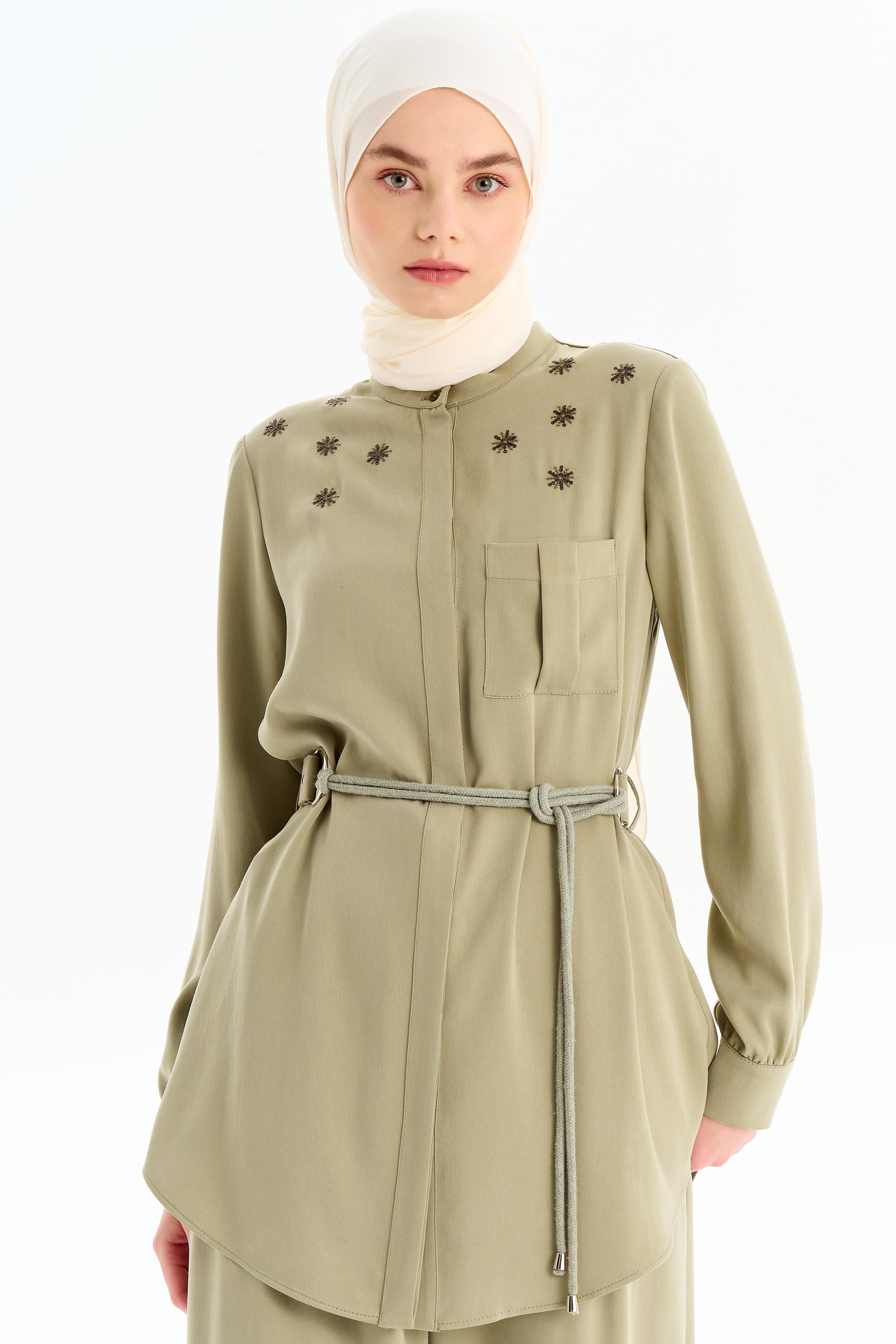Nakış detaylı kemerli tunik, zarif nakış işlemeleri ve şık kemer detayıyla öne çıkar. Yüksek kaliteli kumaşı ve ince işçiliği ile dikkat çeken bu tunik, belindeki kemer sayesinde vücuda uyumlu bir siluet oluşturur.