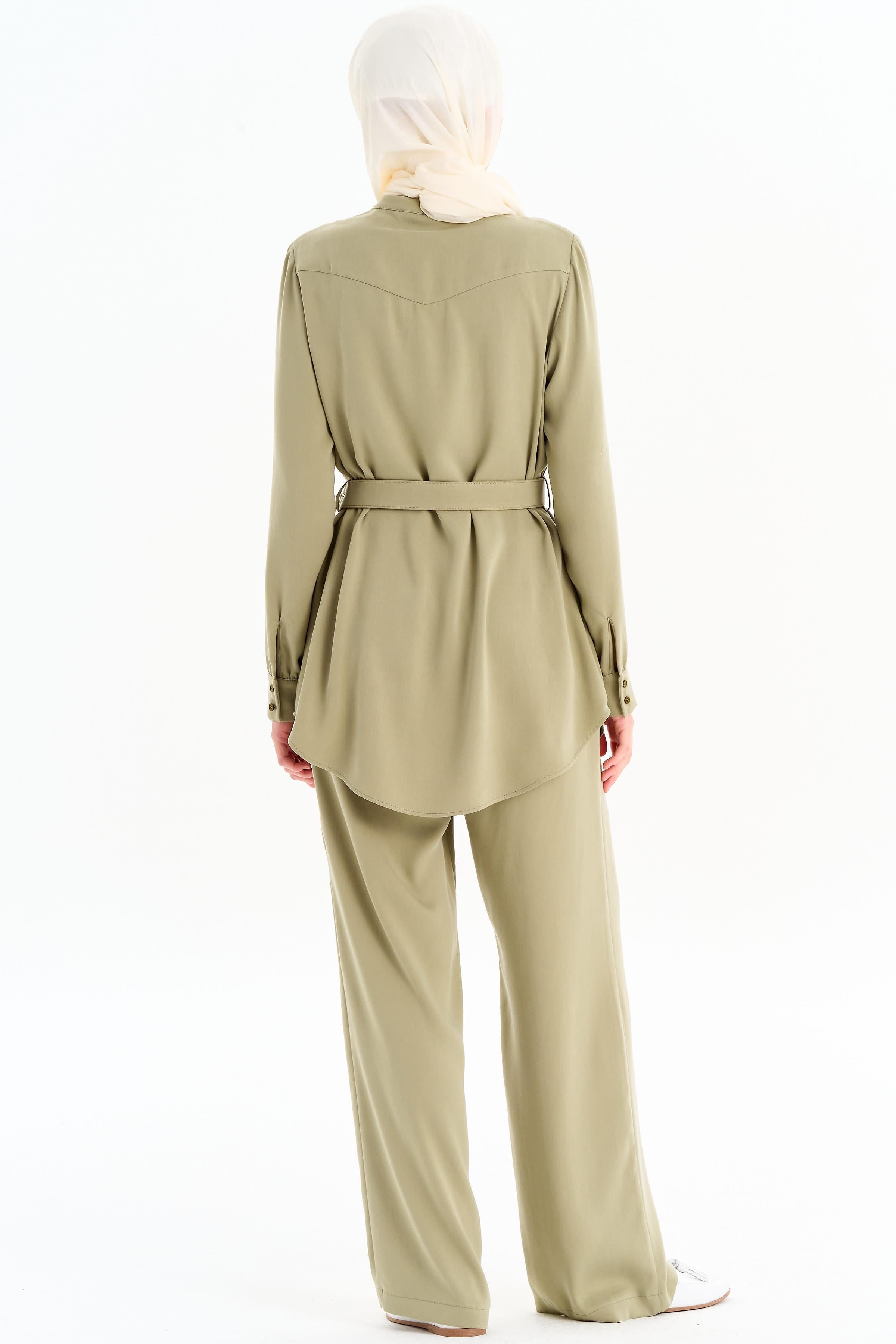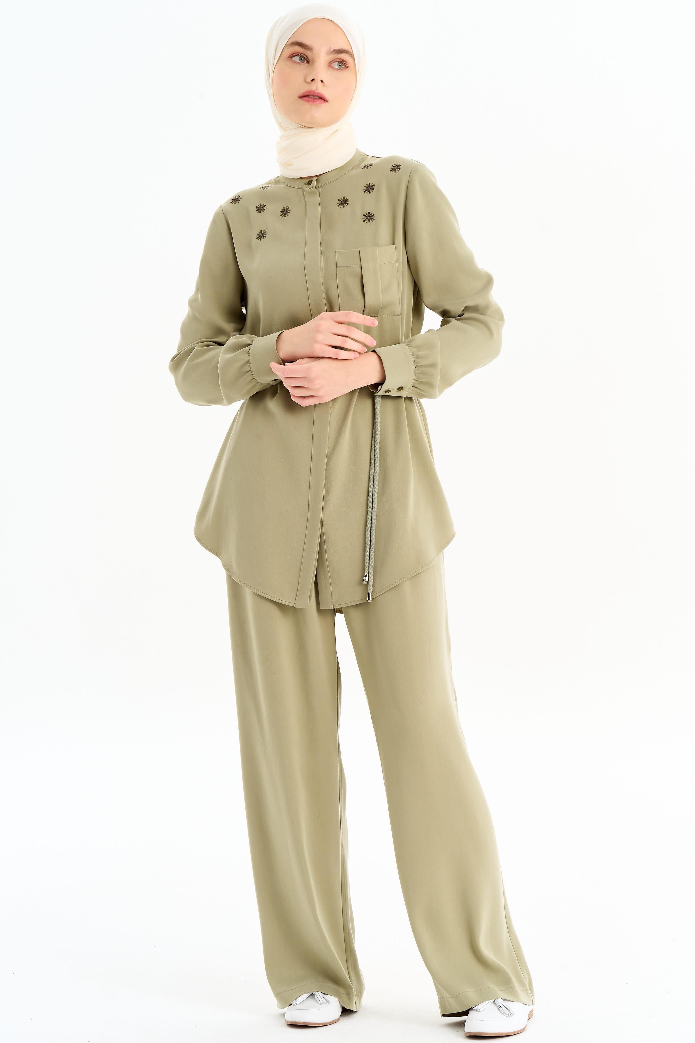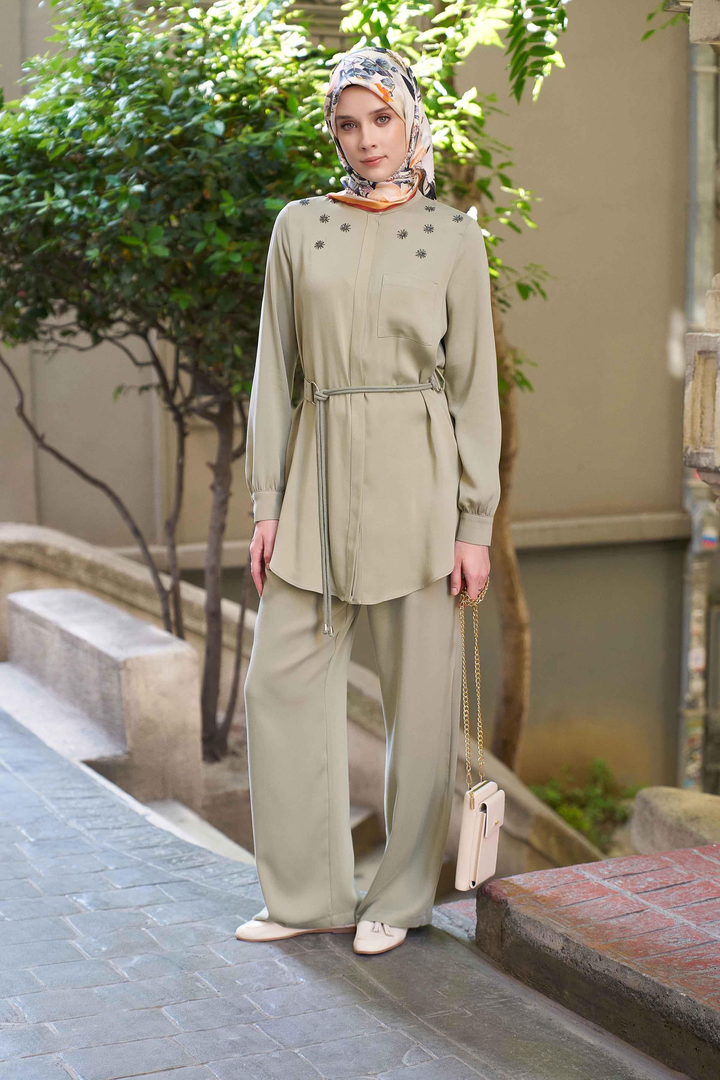 Nakış detaylı kemerli tunik, zarif nakış işlemeleri ve şık kemer detayıyla öne çıkar. Yüksek kaliteli kumaşı ve ince işçiliği ile dikkat çeken bu tunik, belindeki kemer sayesinde vücuda uyumlu bir siluet oluşturur.