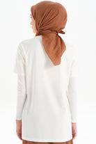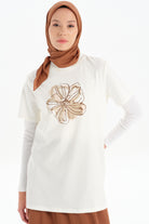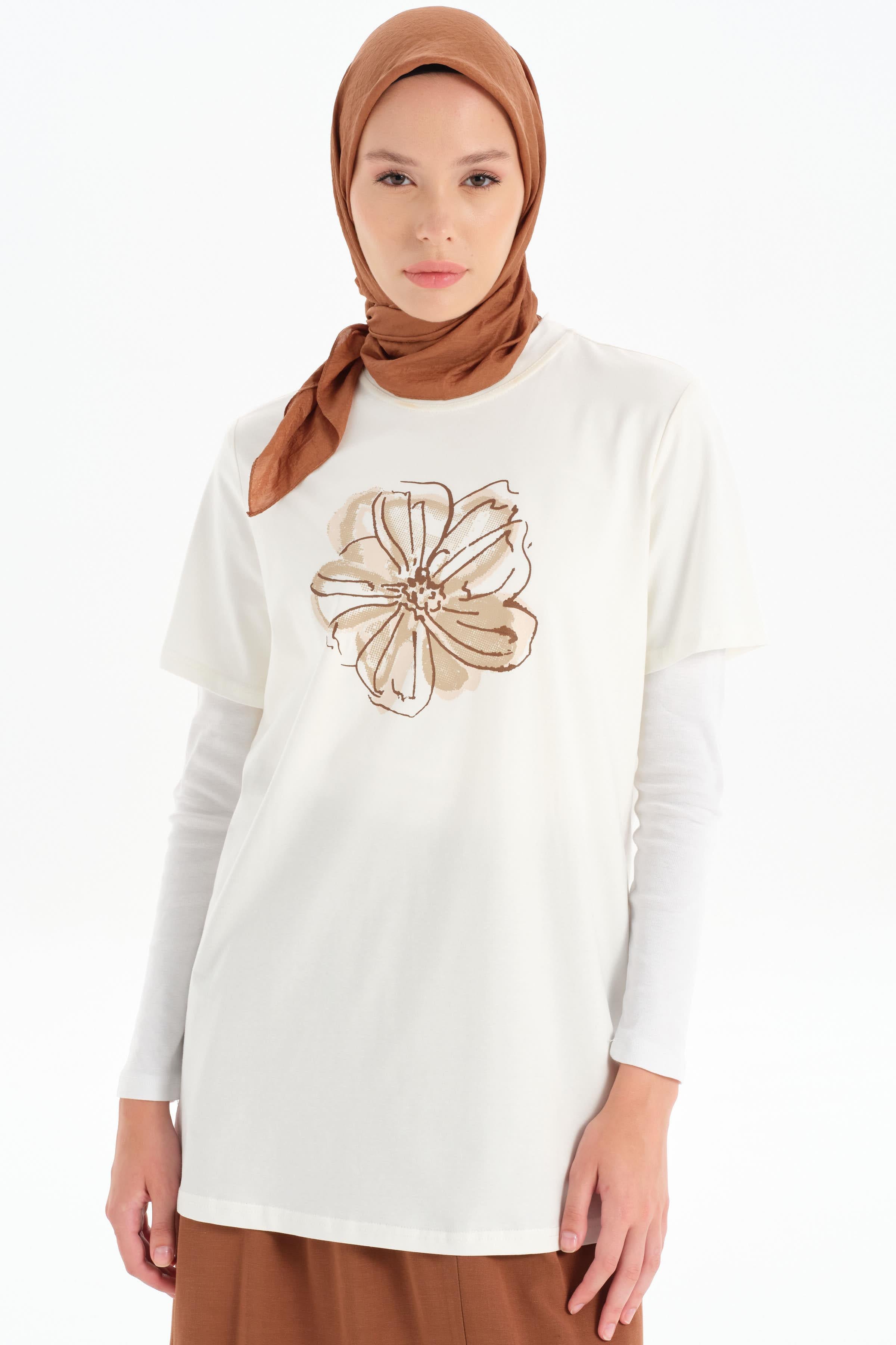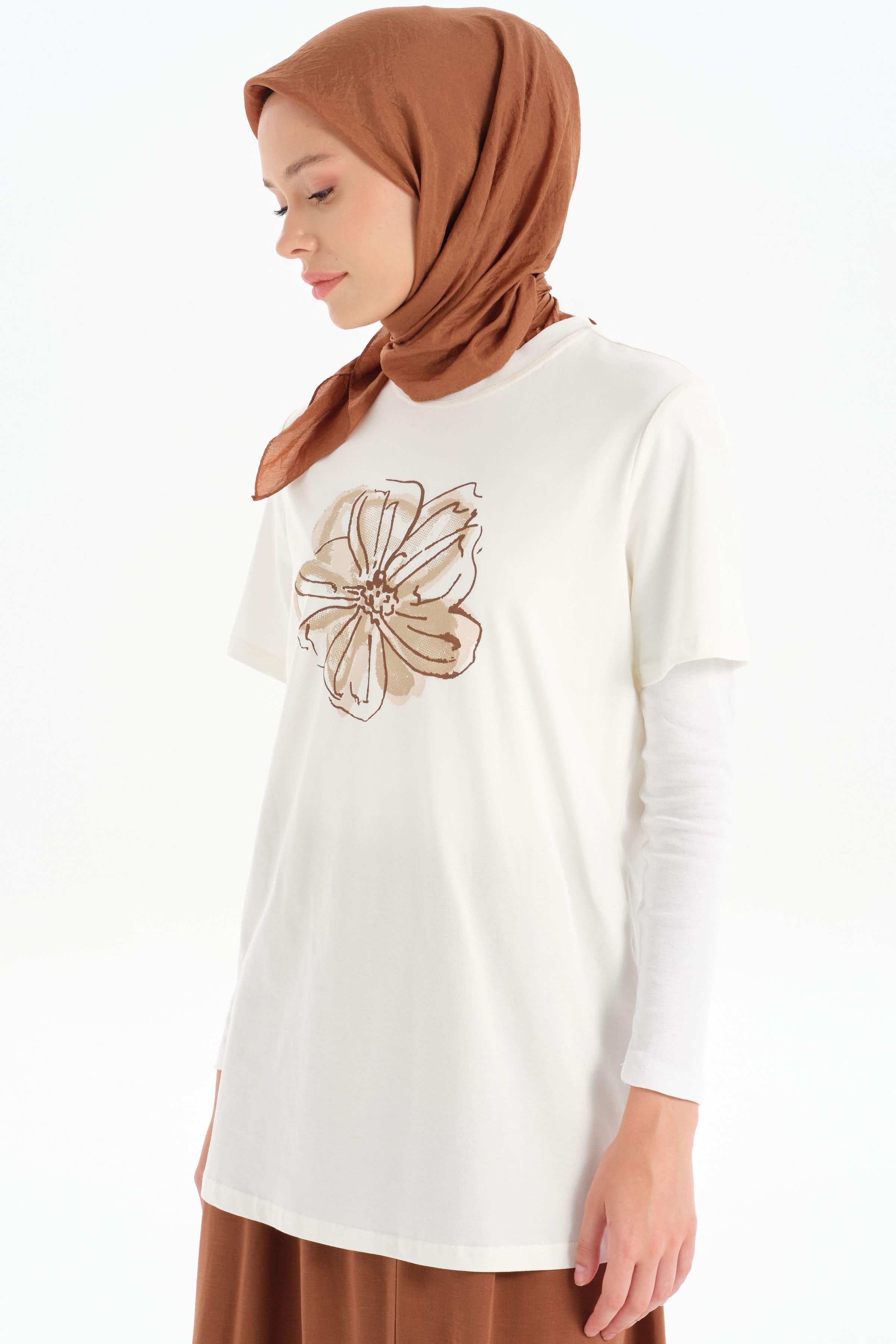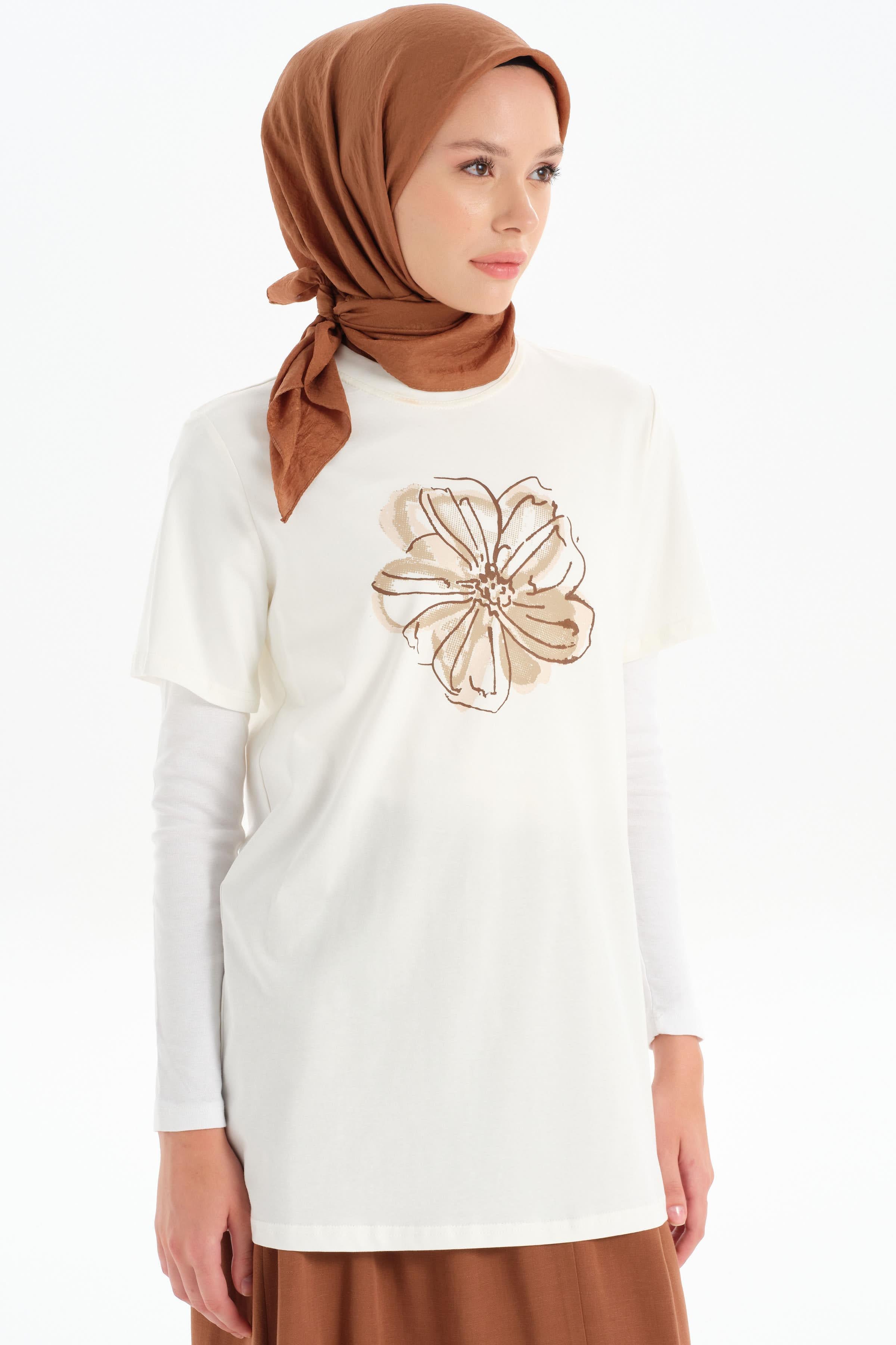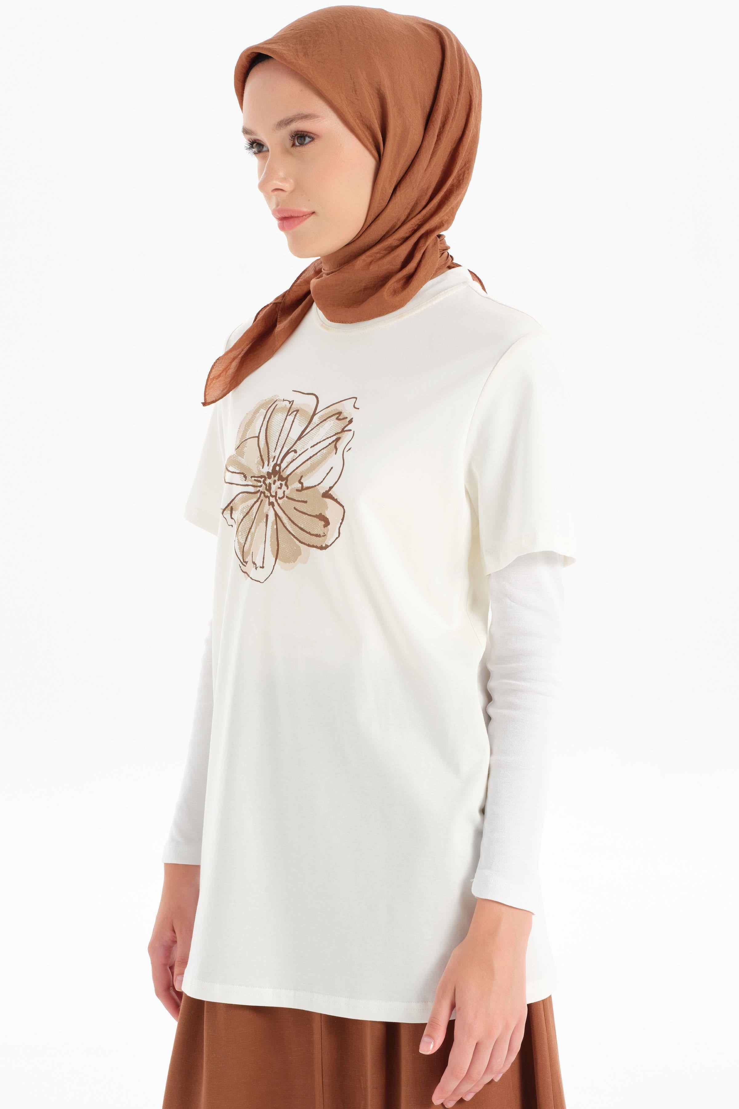 Ön Desen Baskılı Örme Tişört - Beyaz- Kahve