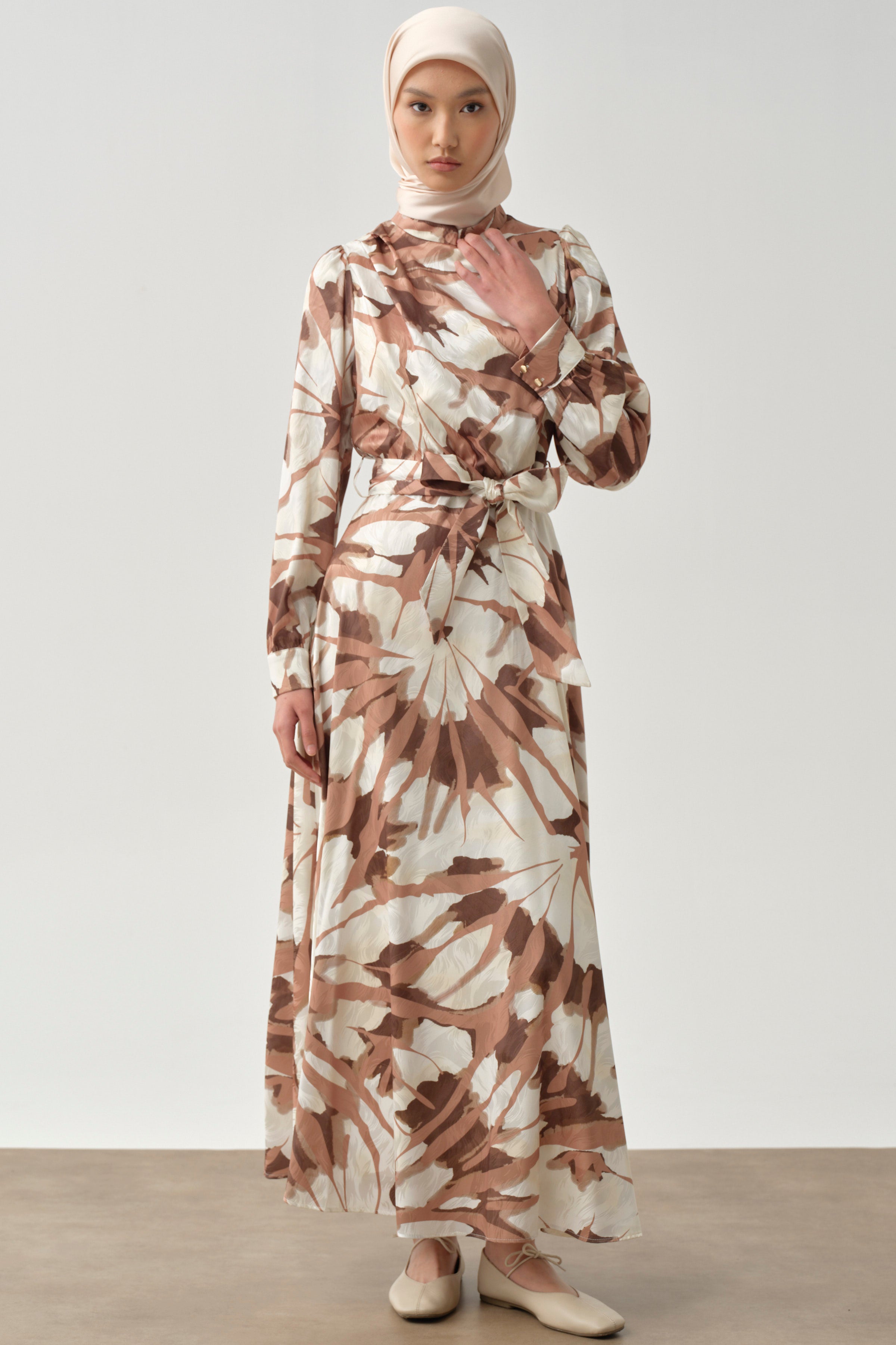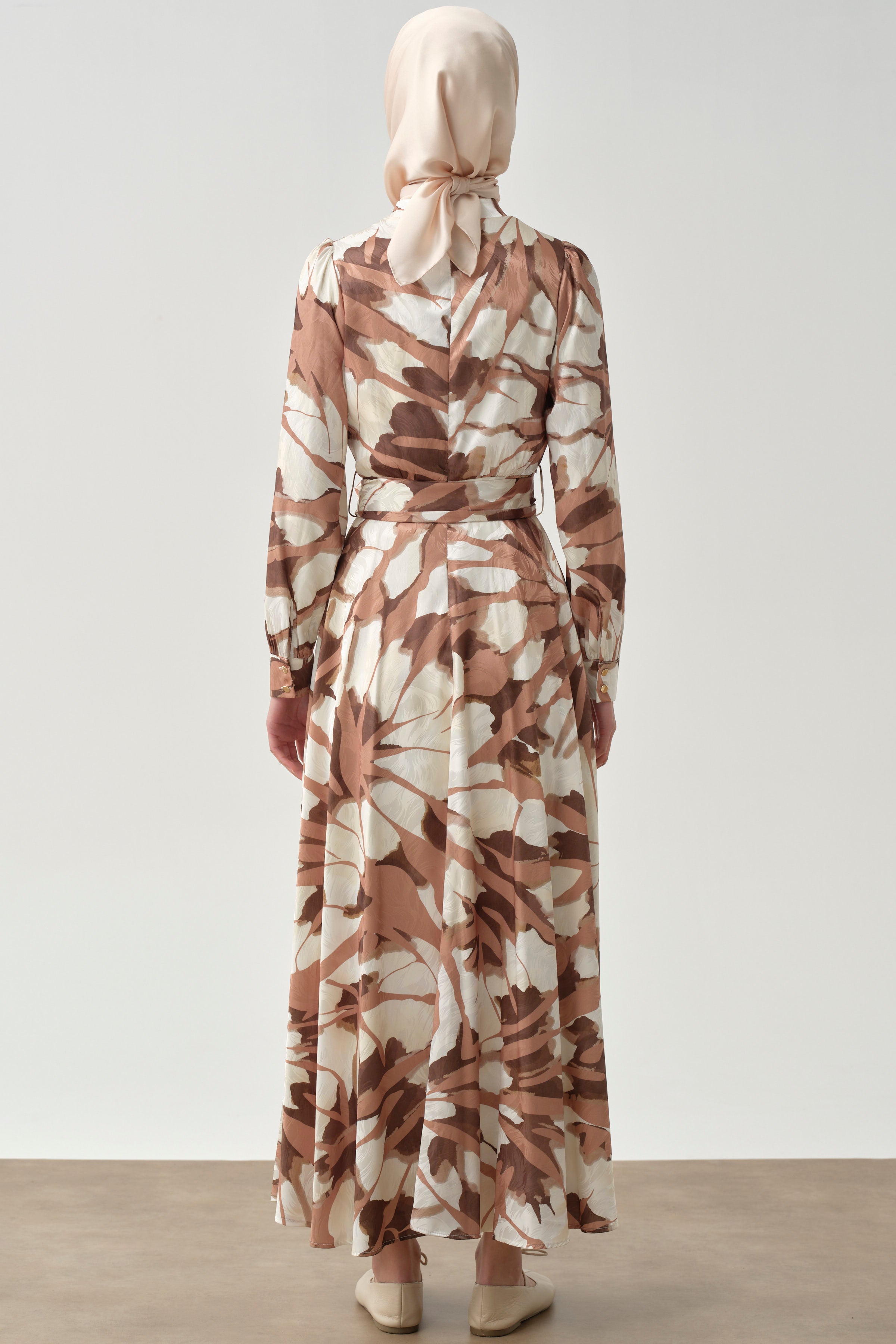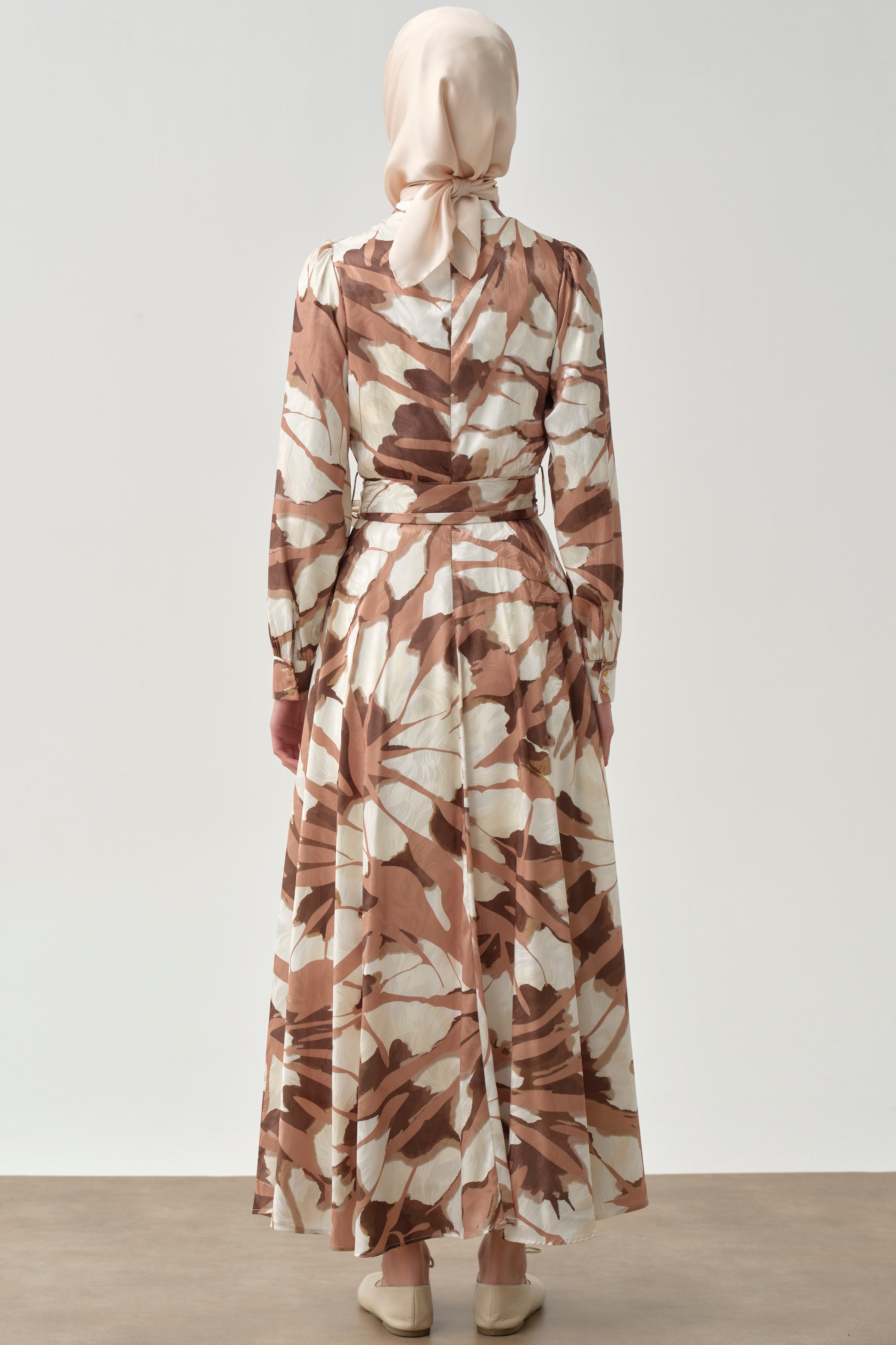 Pile Ve Büzgü Detaylı Desenli Elbise - Kahve