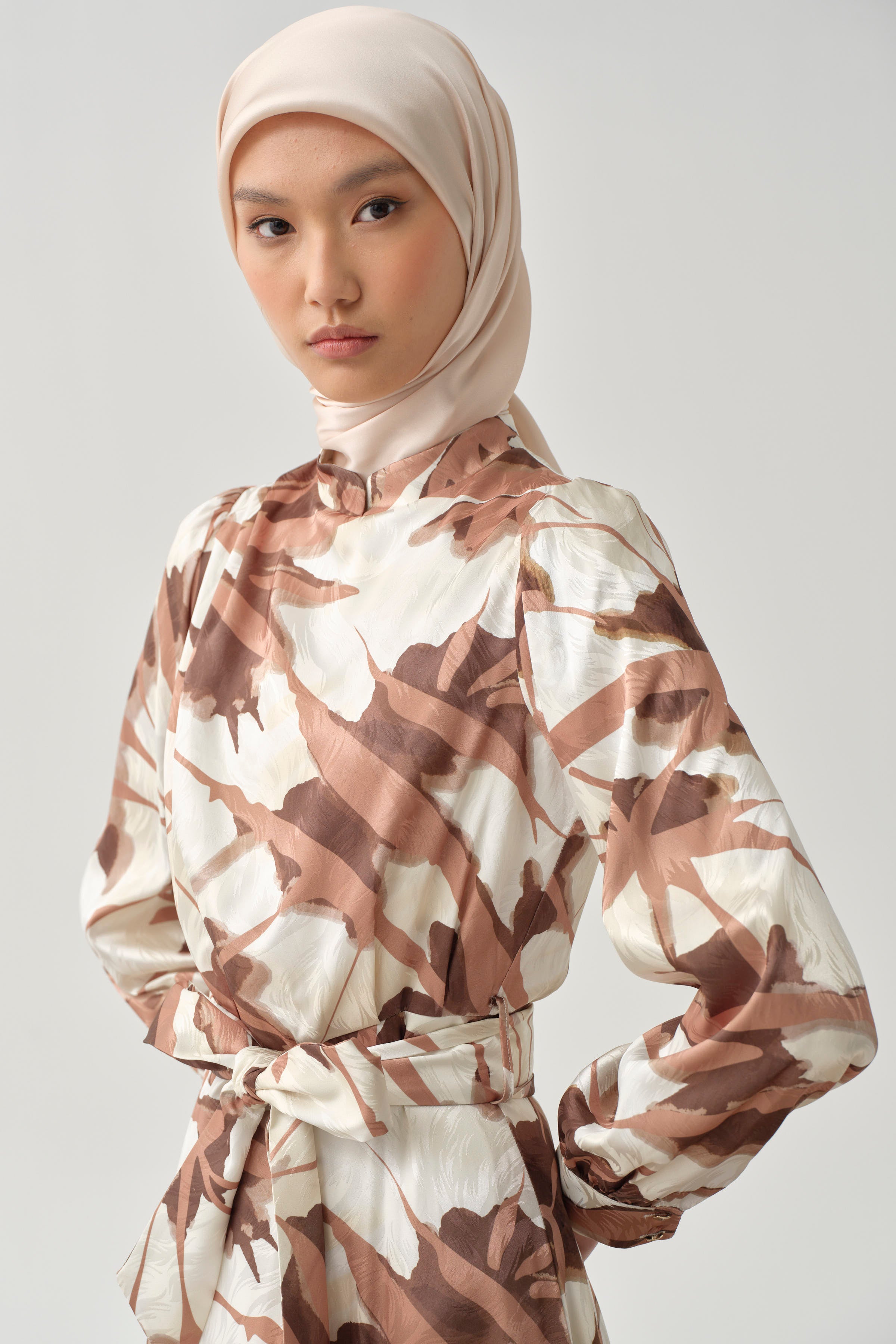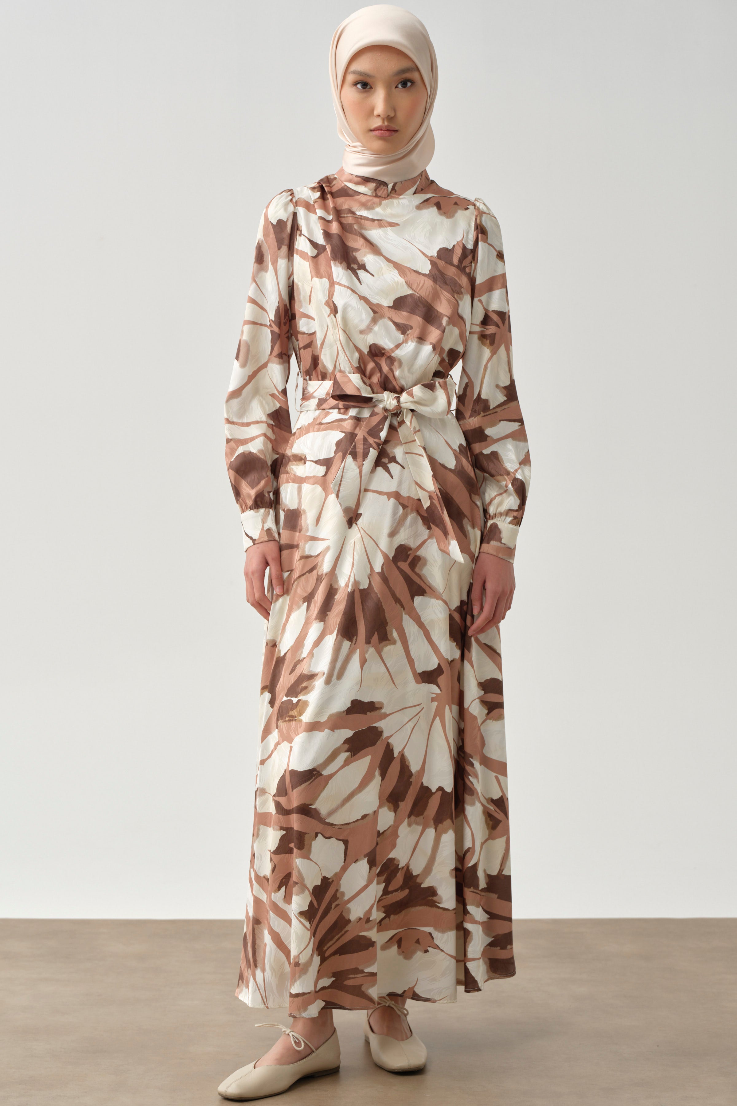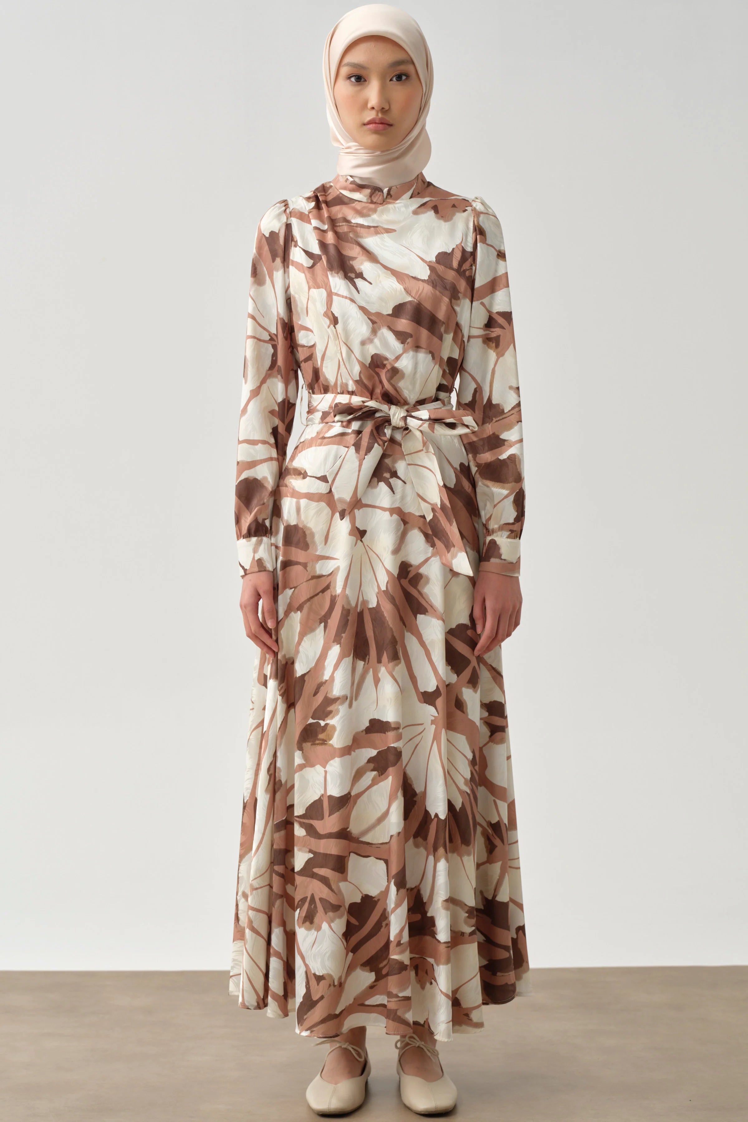 Pile Ve Büzgü Detaylı Desenli Elbise - Kahve