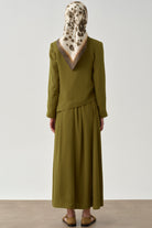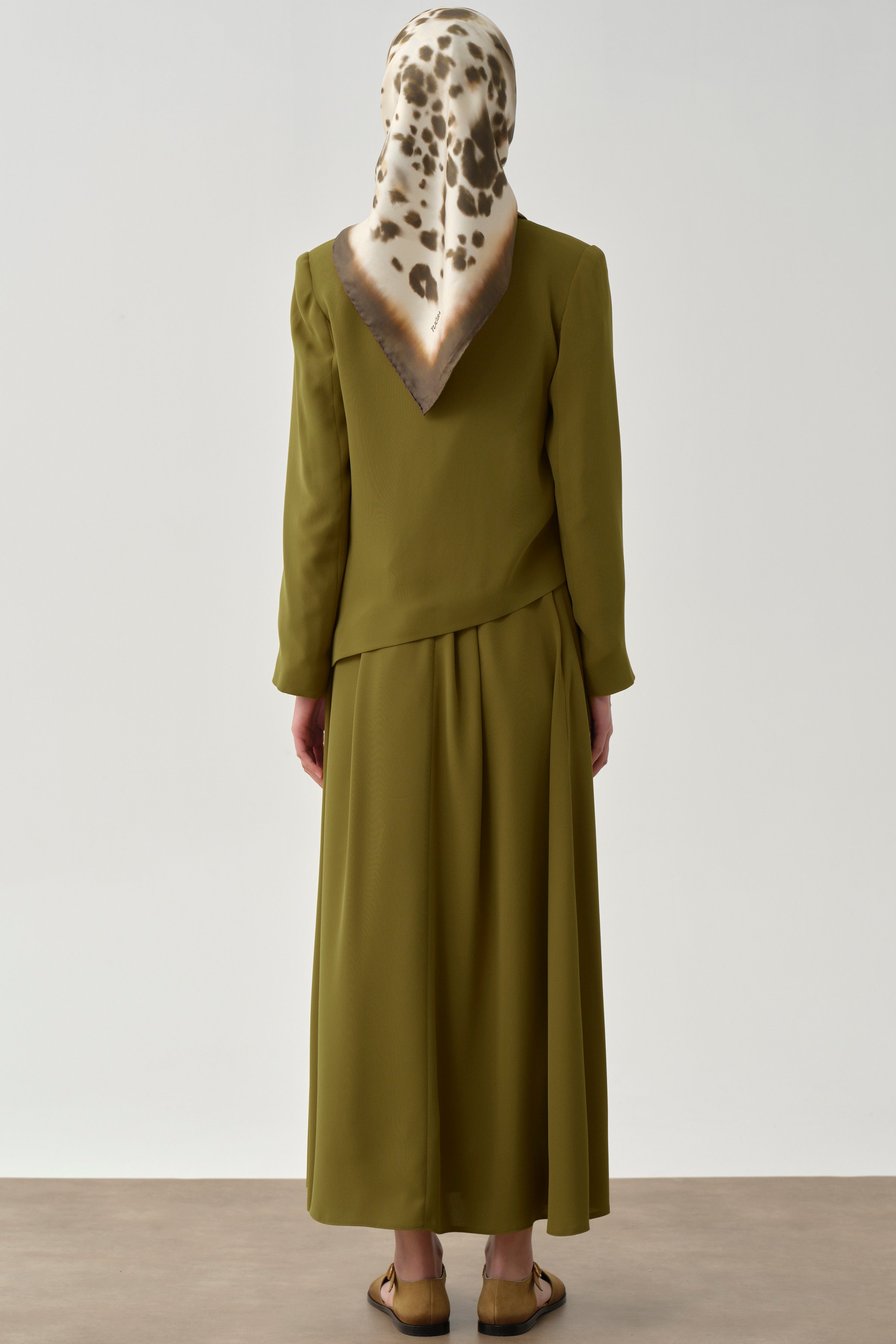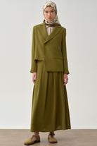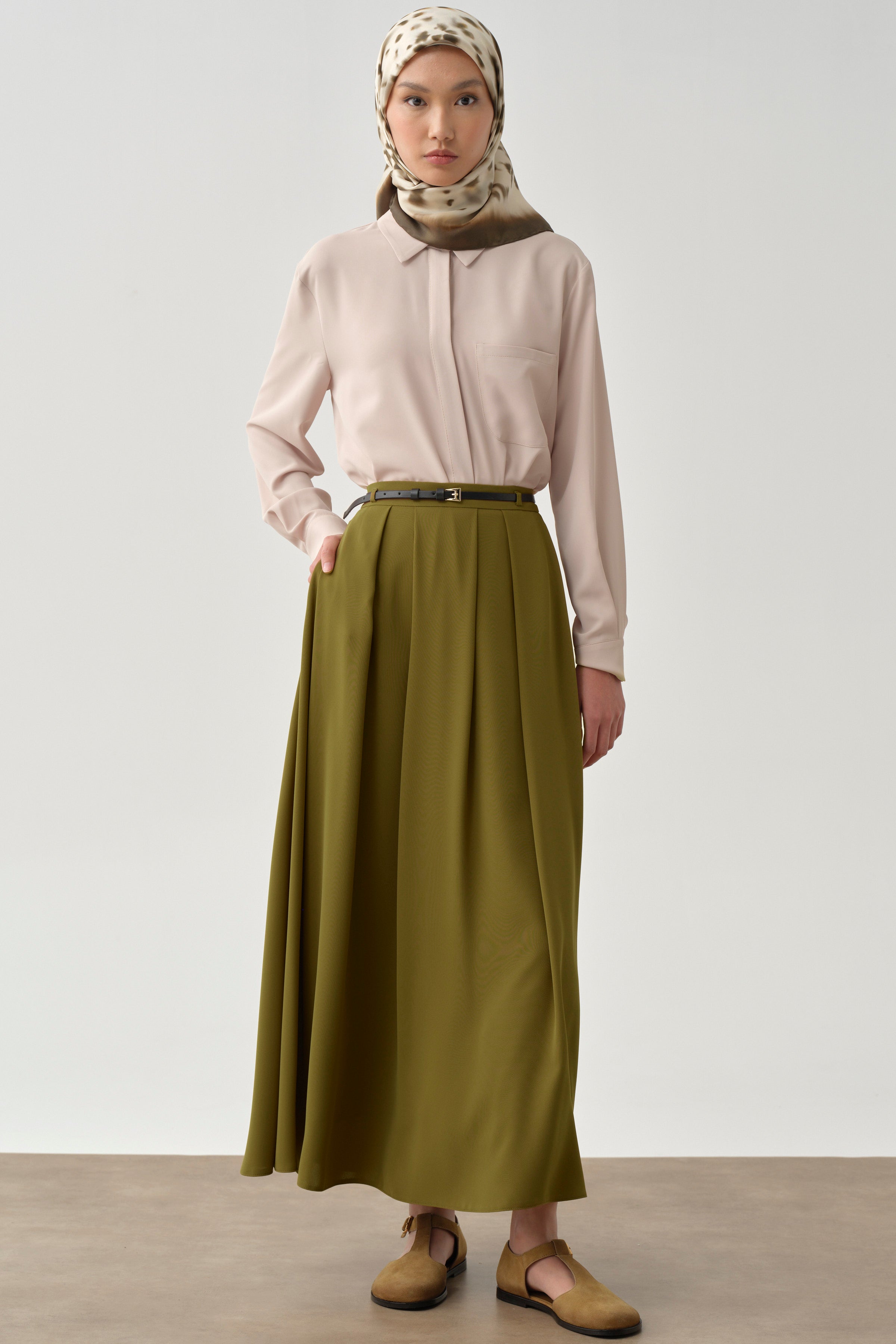 Pileli ve kemerli tasarımıyla klasik şıklığı yansıtan bu etek, zarif ve feminen bir siluet sunuyor. Akıcı duruşu hareket özgürlüğü sağlarken, kemer detayı belinizi vurgulayarak şık bir görünüm kazandırıyor.