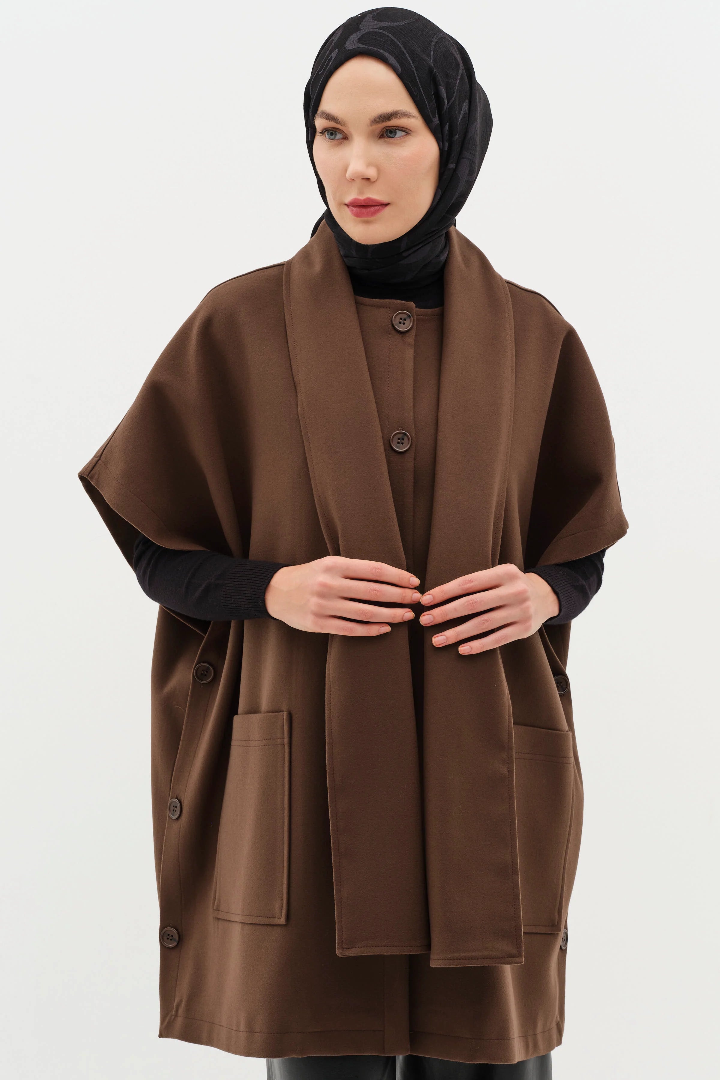 Seyyar şal yaka detayıyla çok yönlü bir kullanım sunan bu panço, şıklık ve konforu bir arada sunuyor. Yumuşak dokusu ve modern kesimiyle hem günlük kombinlerde hem de özel anlarda zarif bir görünüm sağlar.