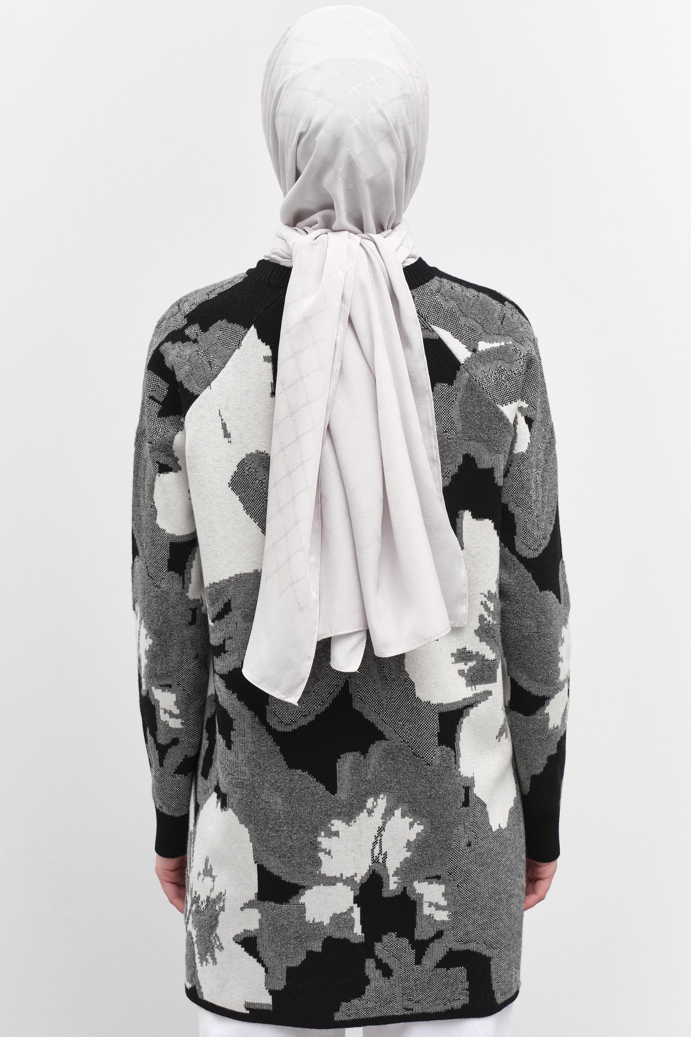 Tuniğin yüzeyine işlenmiş zarif çiçek desenleri, feminen bir hava katarken sade bir zarafet sunar. Motifler, tuniğin genel tonuyla uyumlu bir şekilde dengelenmiştir.