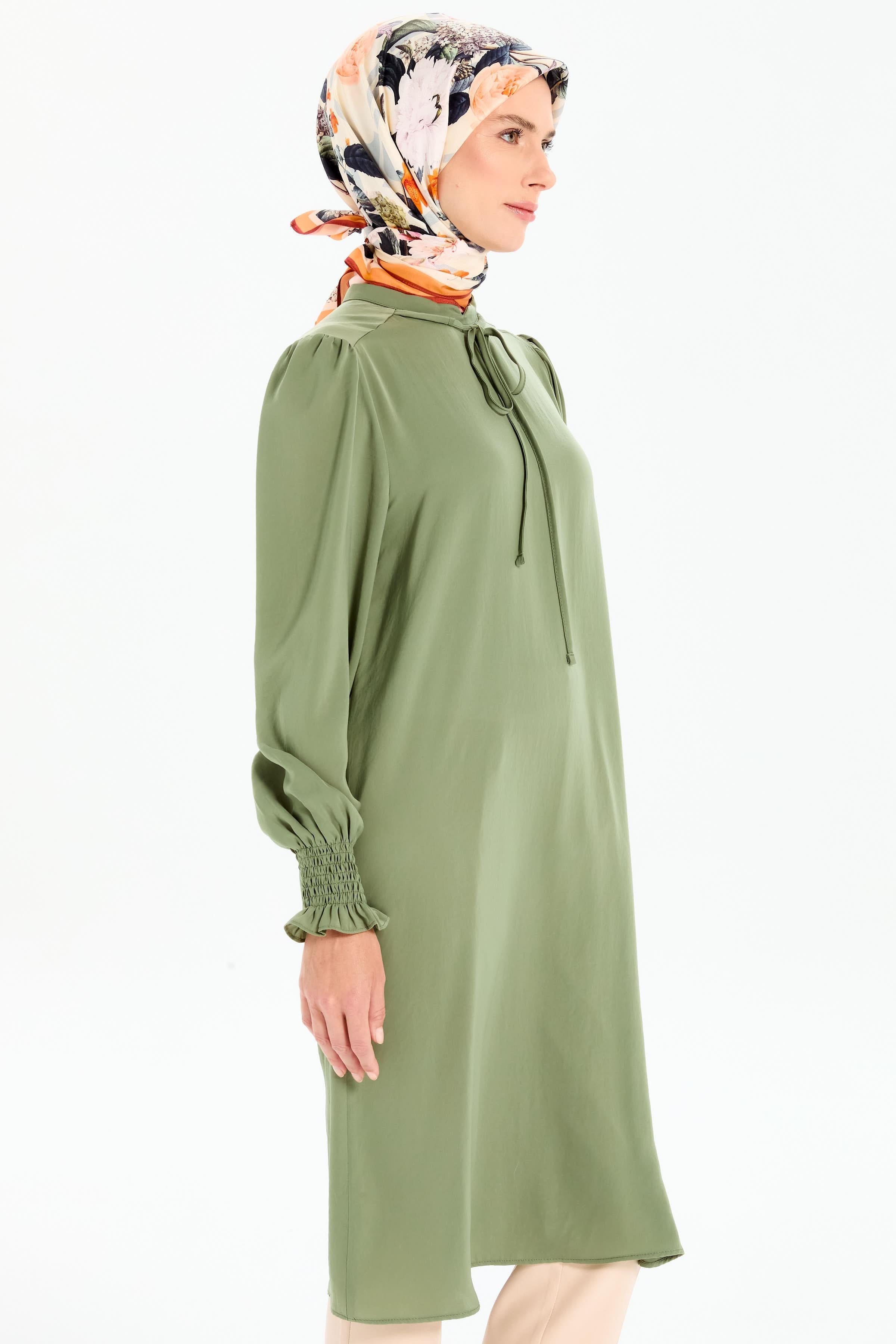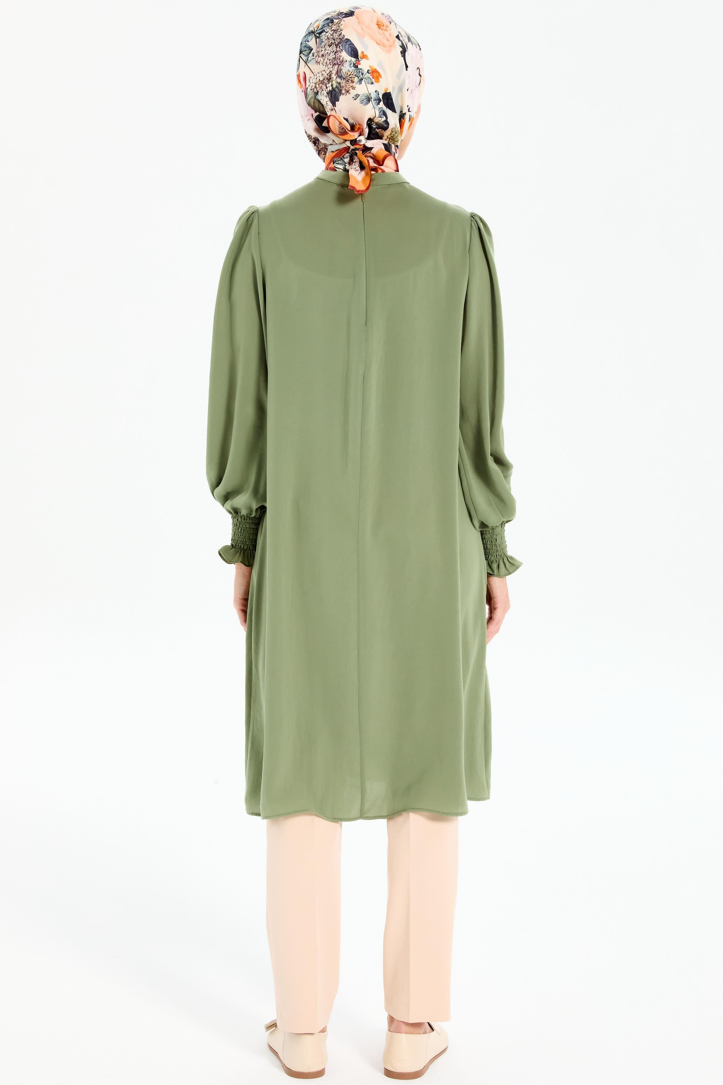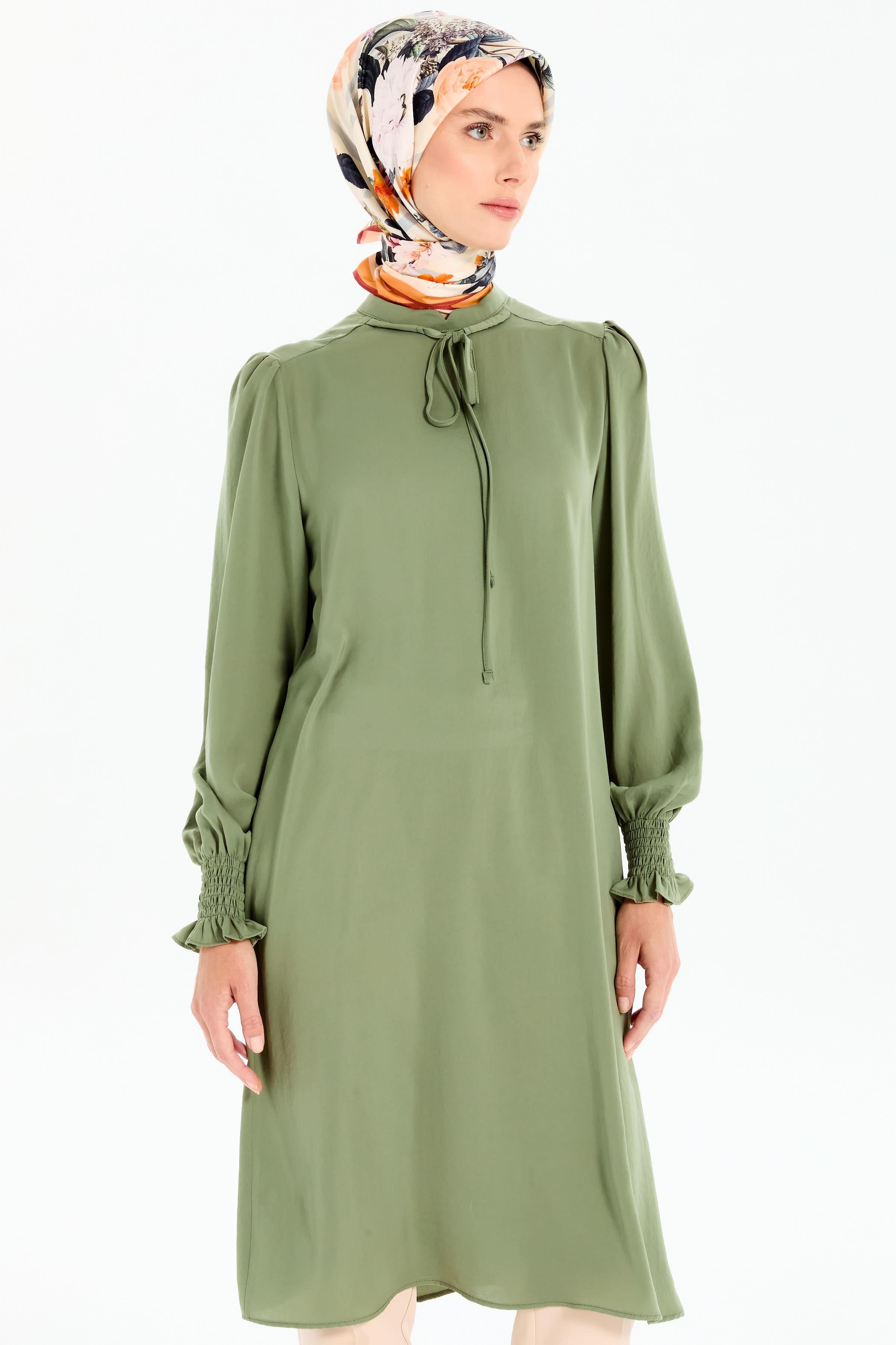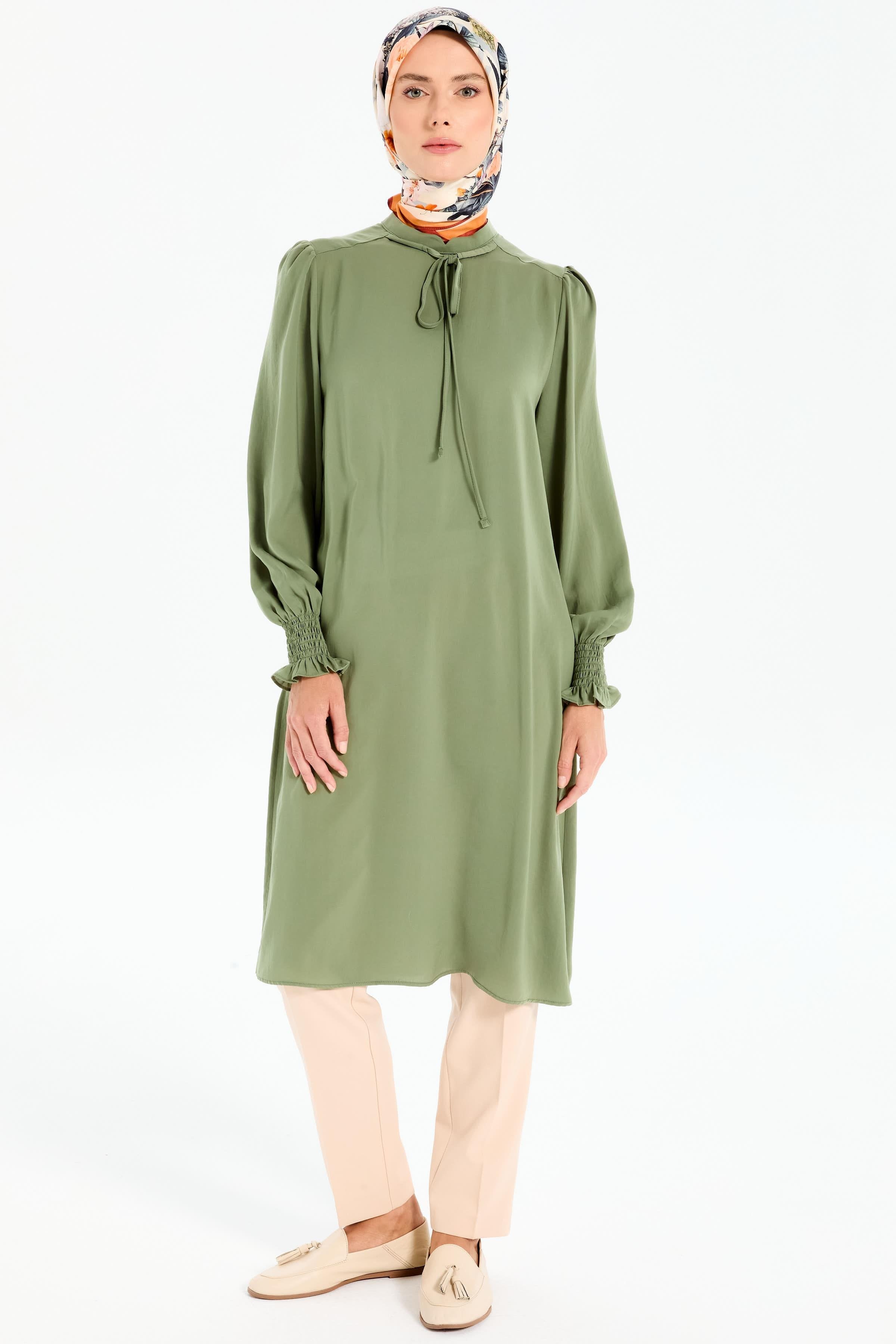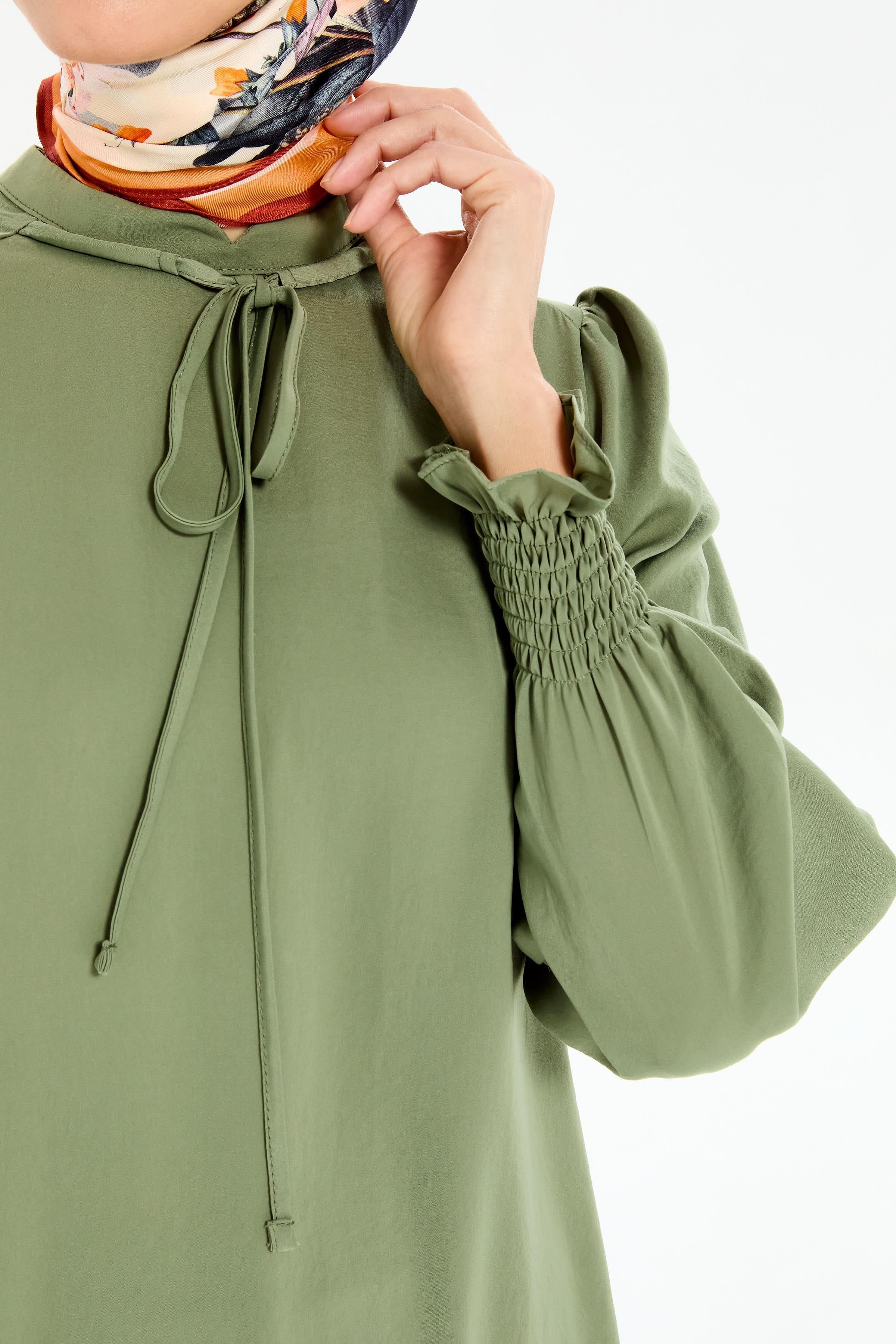 Yaka Bağcık Detaylı Kolları Lastikli Tunik - Haki