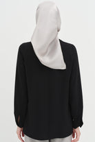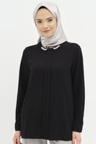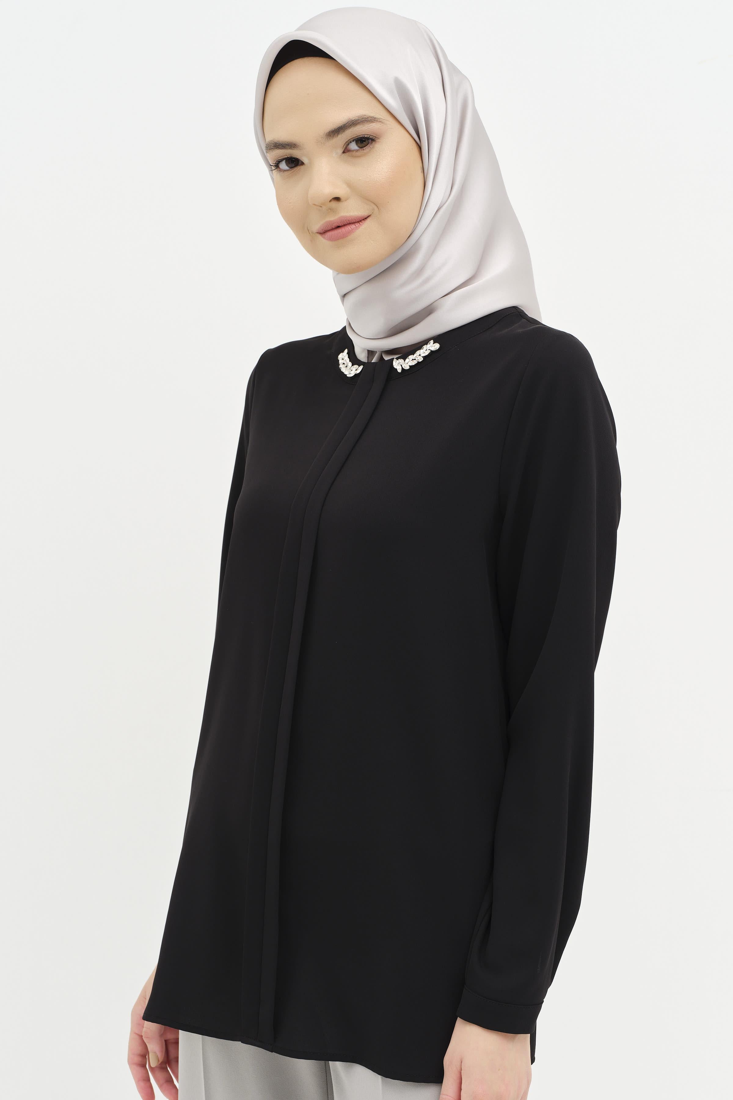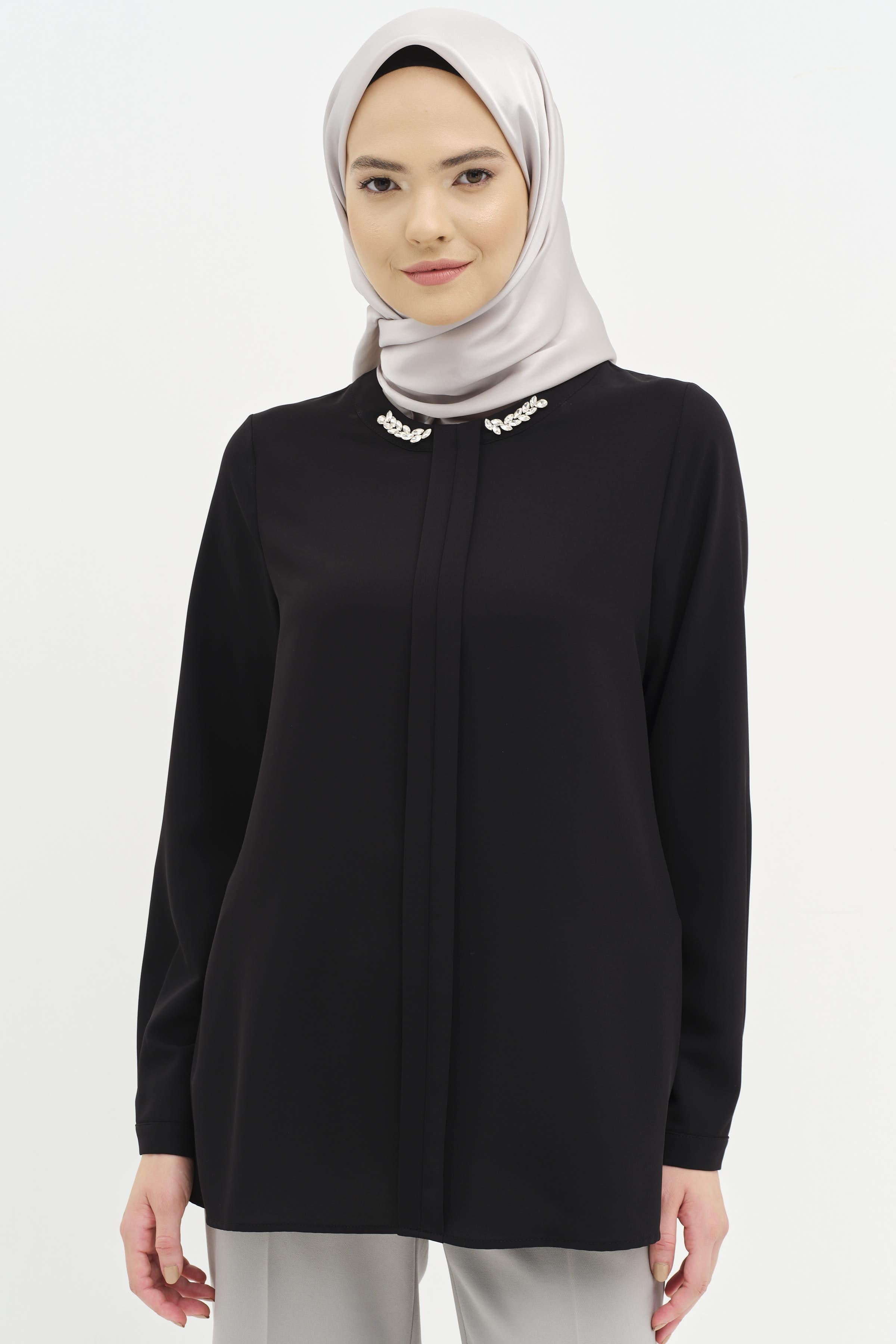 Yakası Taşlı Pile Detaylı Bluz - Siyah