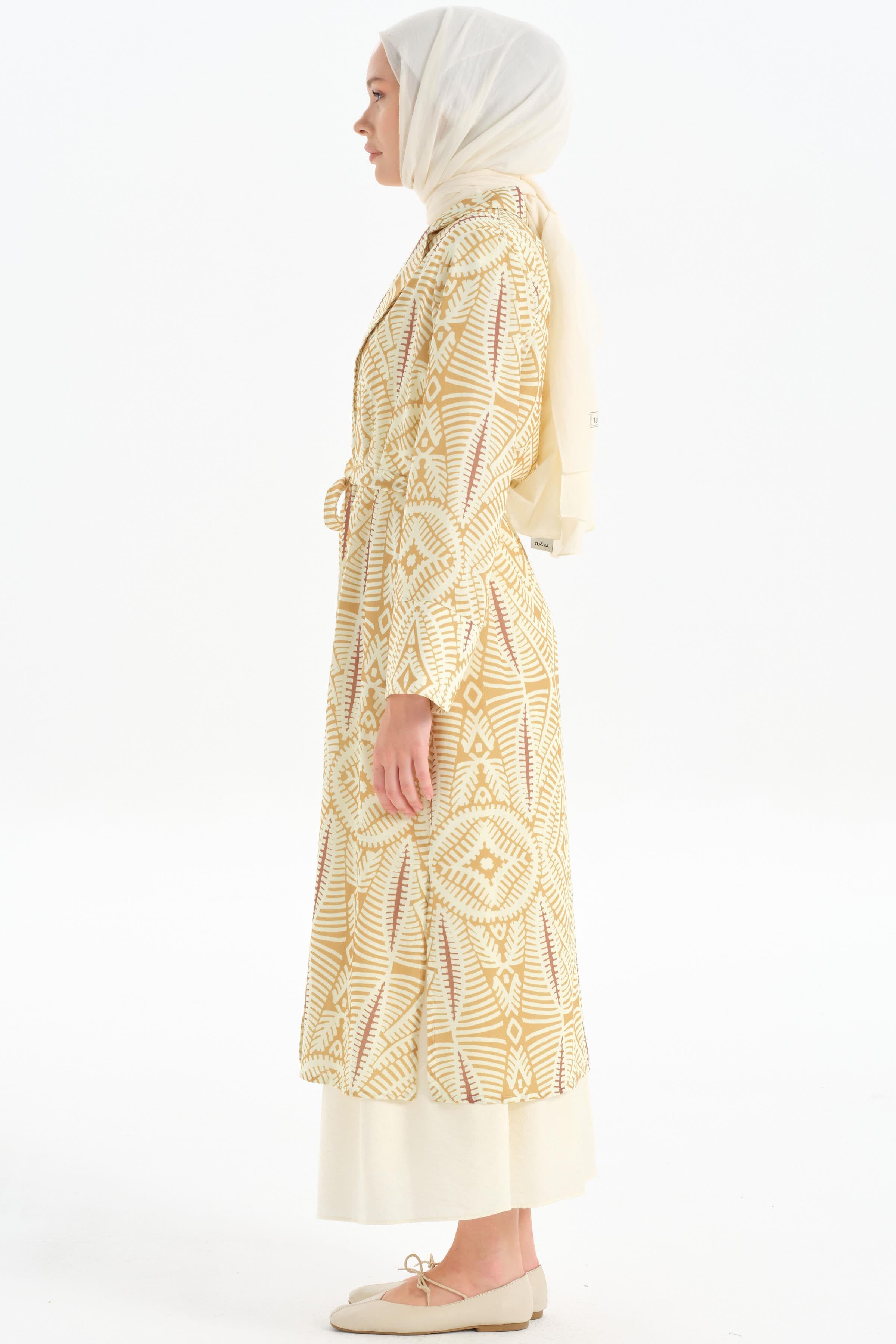 Etnik desenlerin zamansız şıklığını yansıtan bu giy-çık, stil sahibi kadınların dolaplarının vazgeçilmezi olmaya aday. Renkli ve canlı etnik desenleri, tasarıma otantik bir dokunuş katarken, yırtmaç detayları ile hareket özgürlüğü sunuyor.